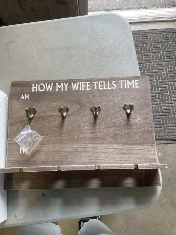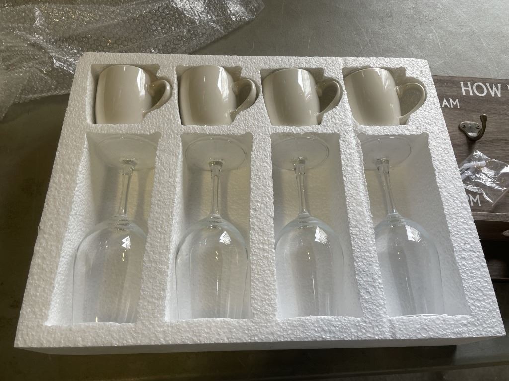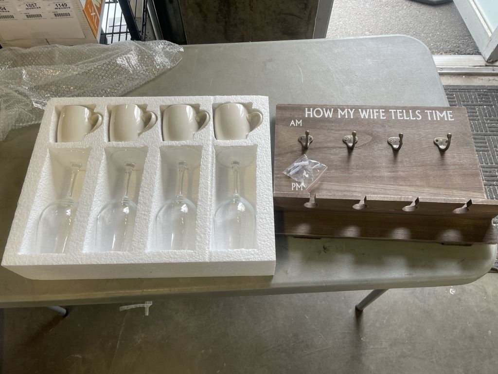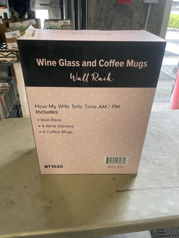 NEW WINE RACK WITH 4 WINE GLASSES AND 4 MUGS - HOW MY WIFE TELLS TIME, RETAIL $74