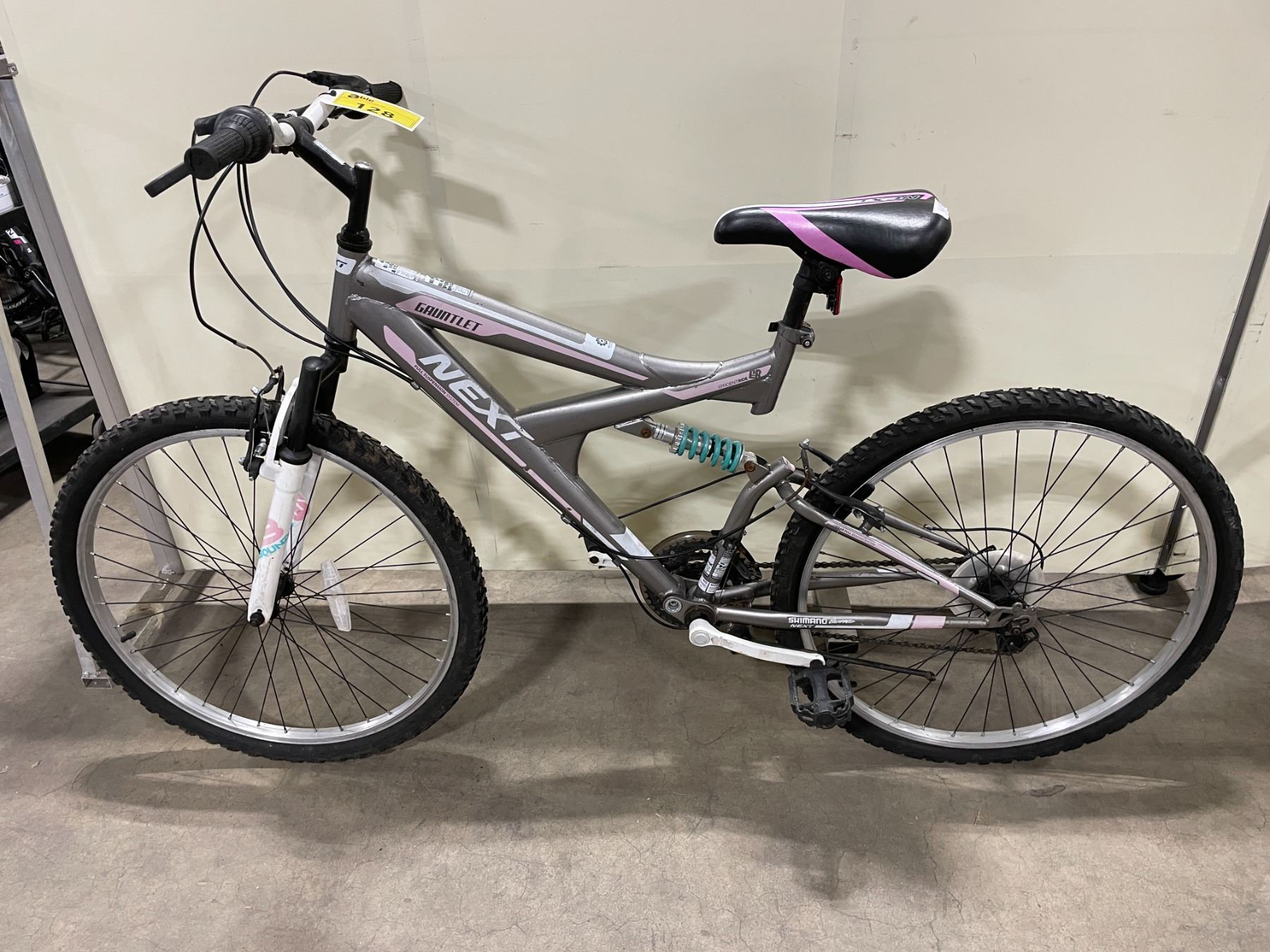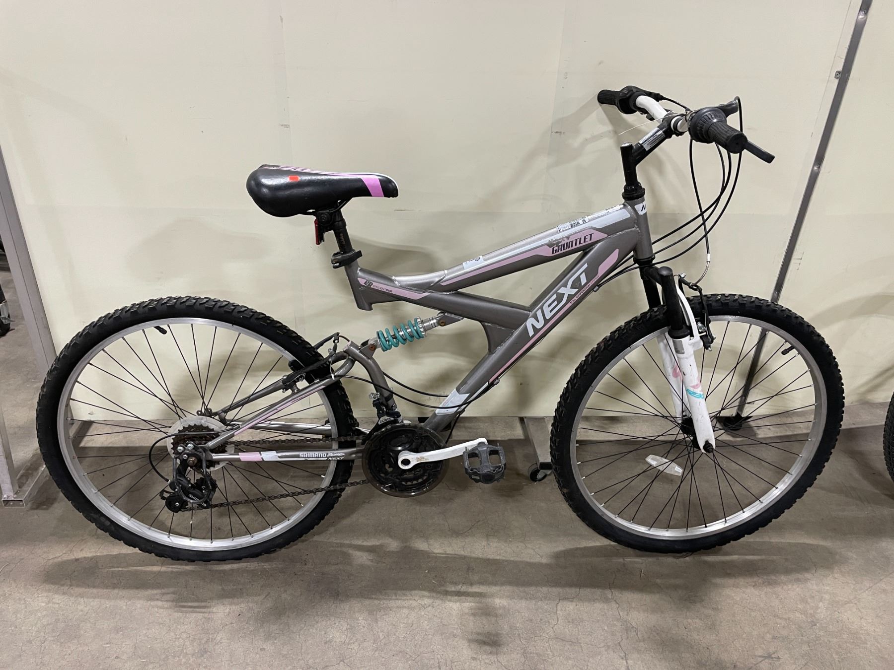 NEXT GAUNTLET GREY ON PINK 12 SPEED ROAD BIKE FULL SUSPENSION
