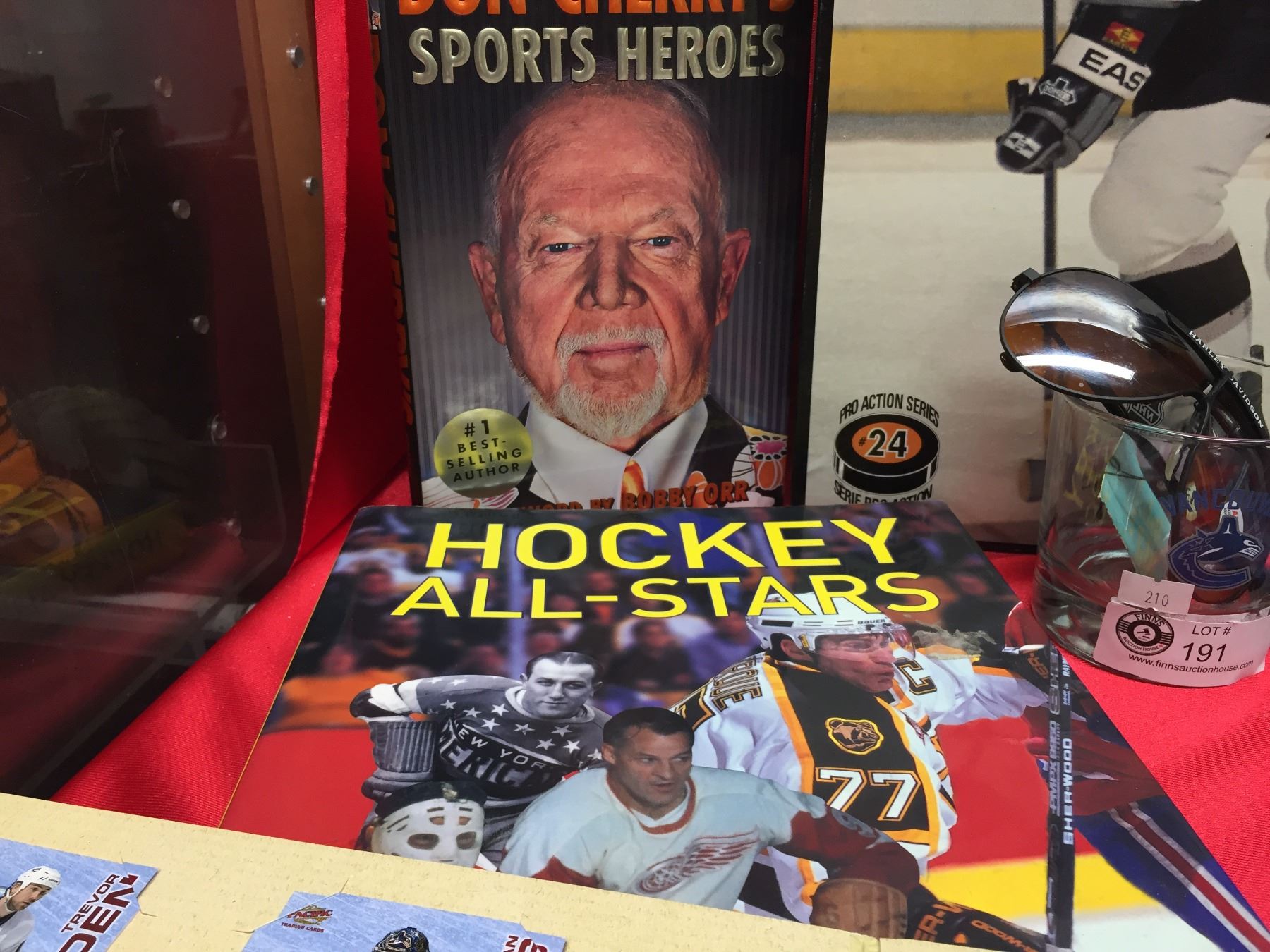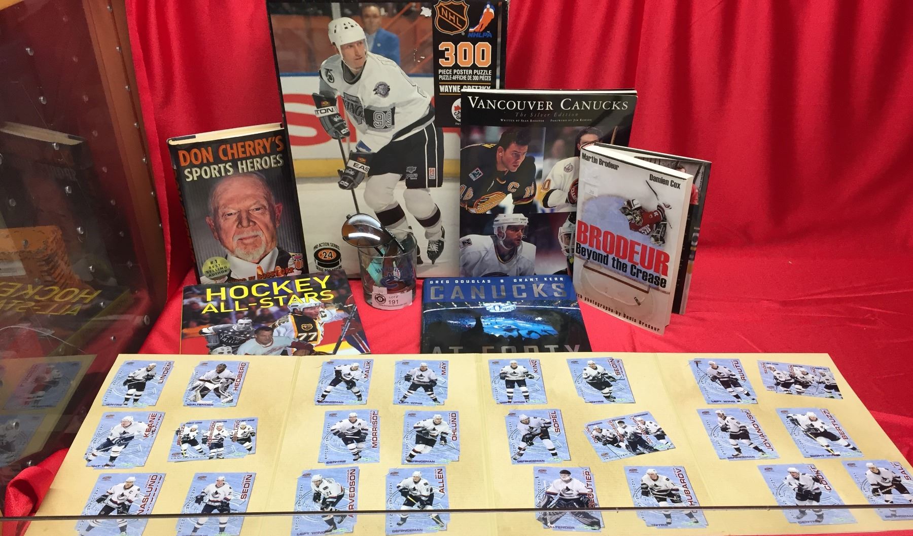 NHL sports Lot. Gretzky 300 Piece Puzzle, Vancouver Canucks books,Trading Cards and Glass. Don Cherry book, Martin Brodeur book and Harley Davidson Sunglasses