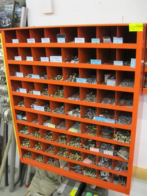 NUT & BOLT BIN WITH CONTENTS & LOT OF HOSE CLAMPS