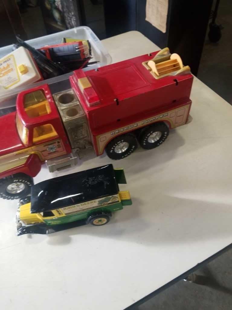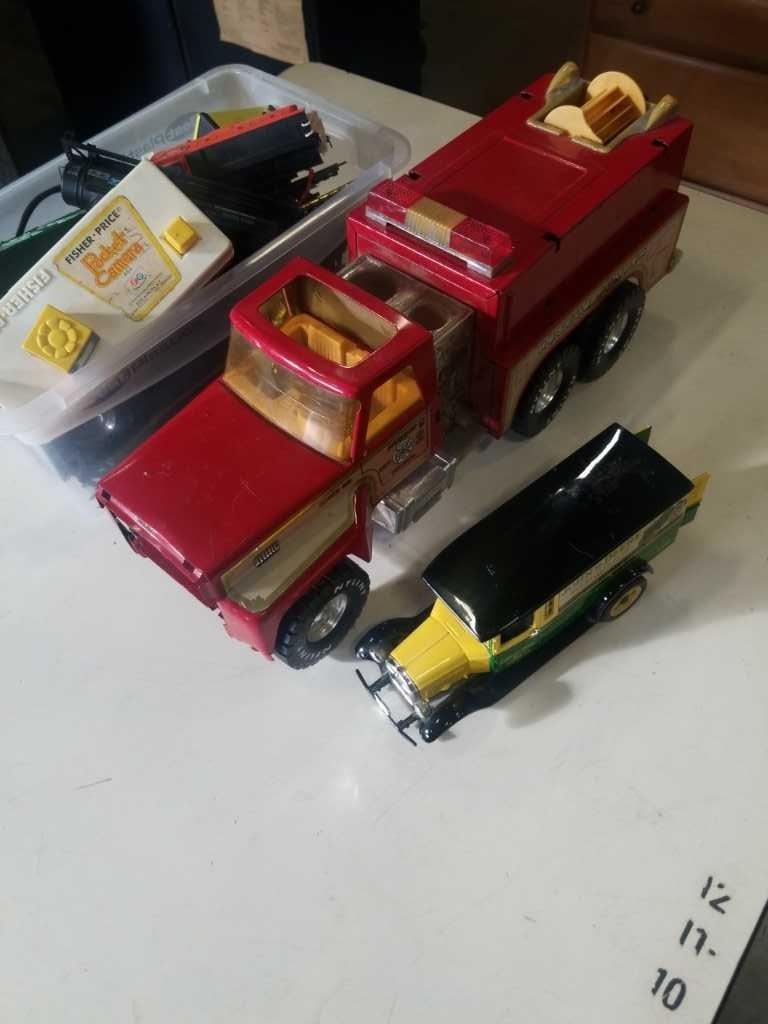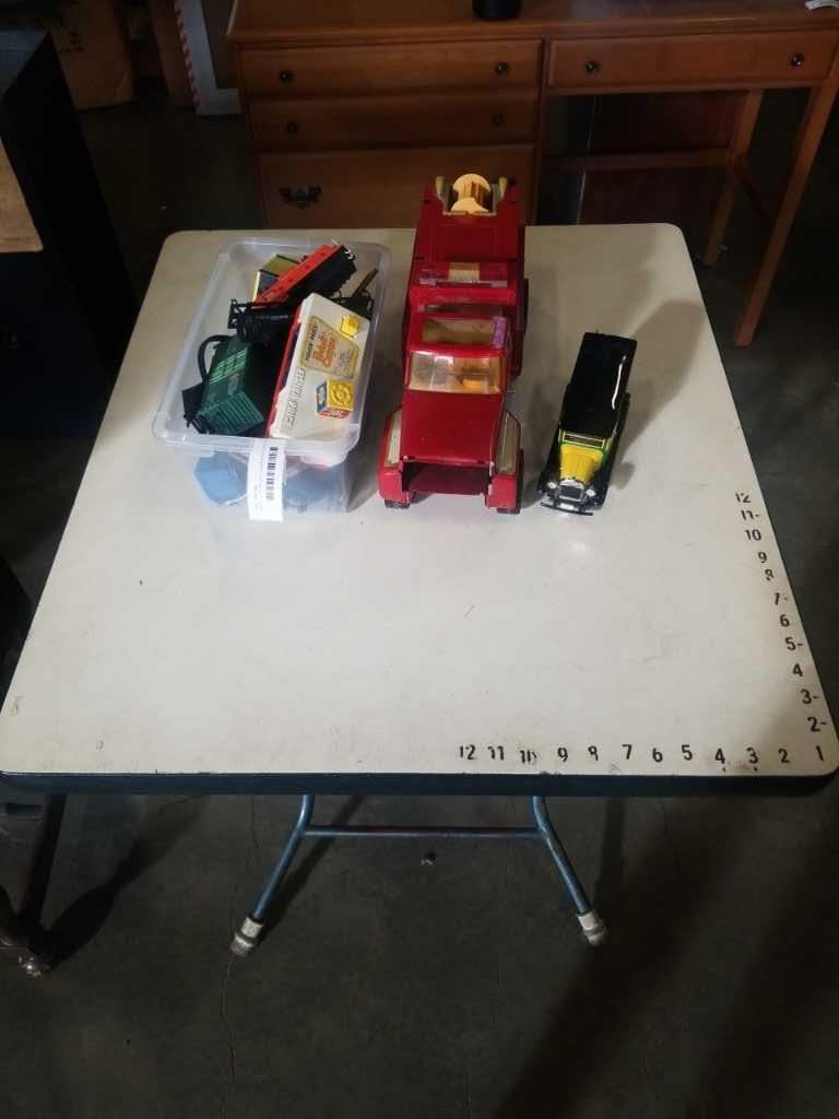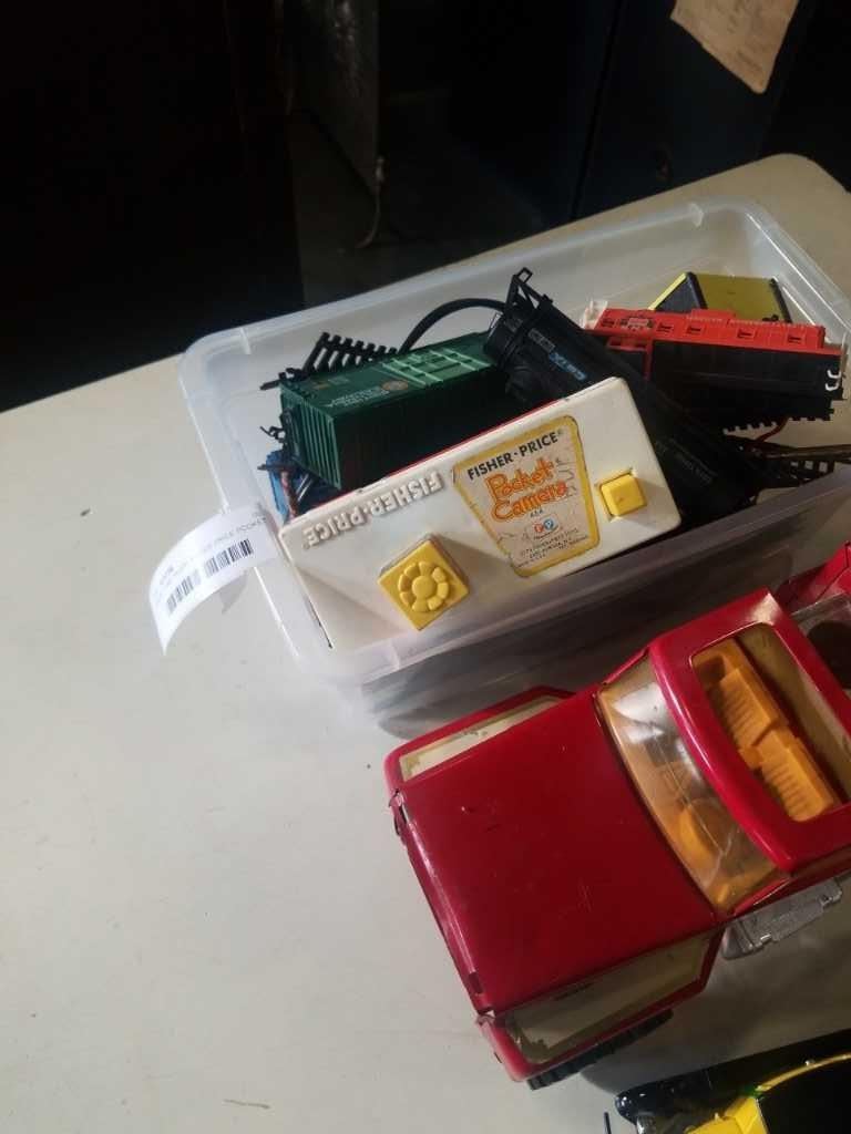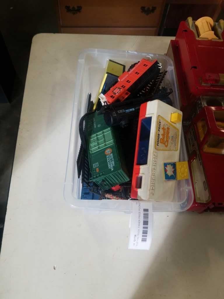 NYLINT FIRE TRUCK, FISHER PRICE PCOKET CAMERA TOY AND TRAY OF HO SCALE TRAIN CARS AND RAIL