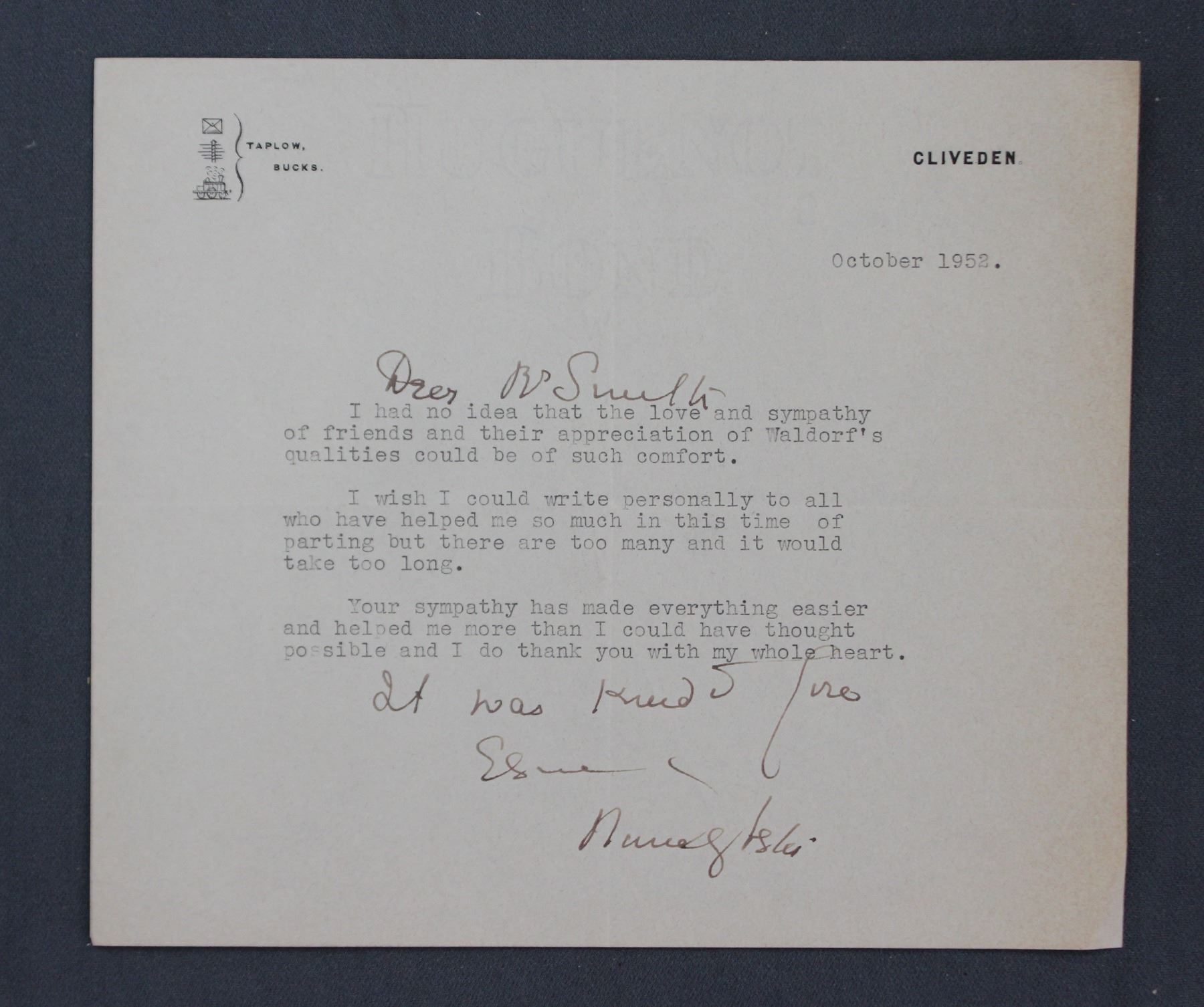 Nancy Witcher Langhorne Astor Letter Signed "Nancy Astor" as Viscountess Astor. One page, 6 3/4" x 7 7/8"; October 1952.