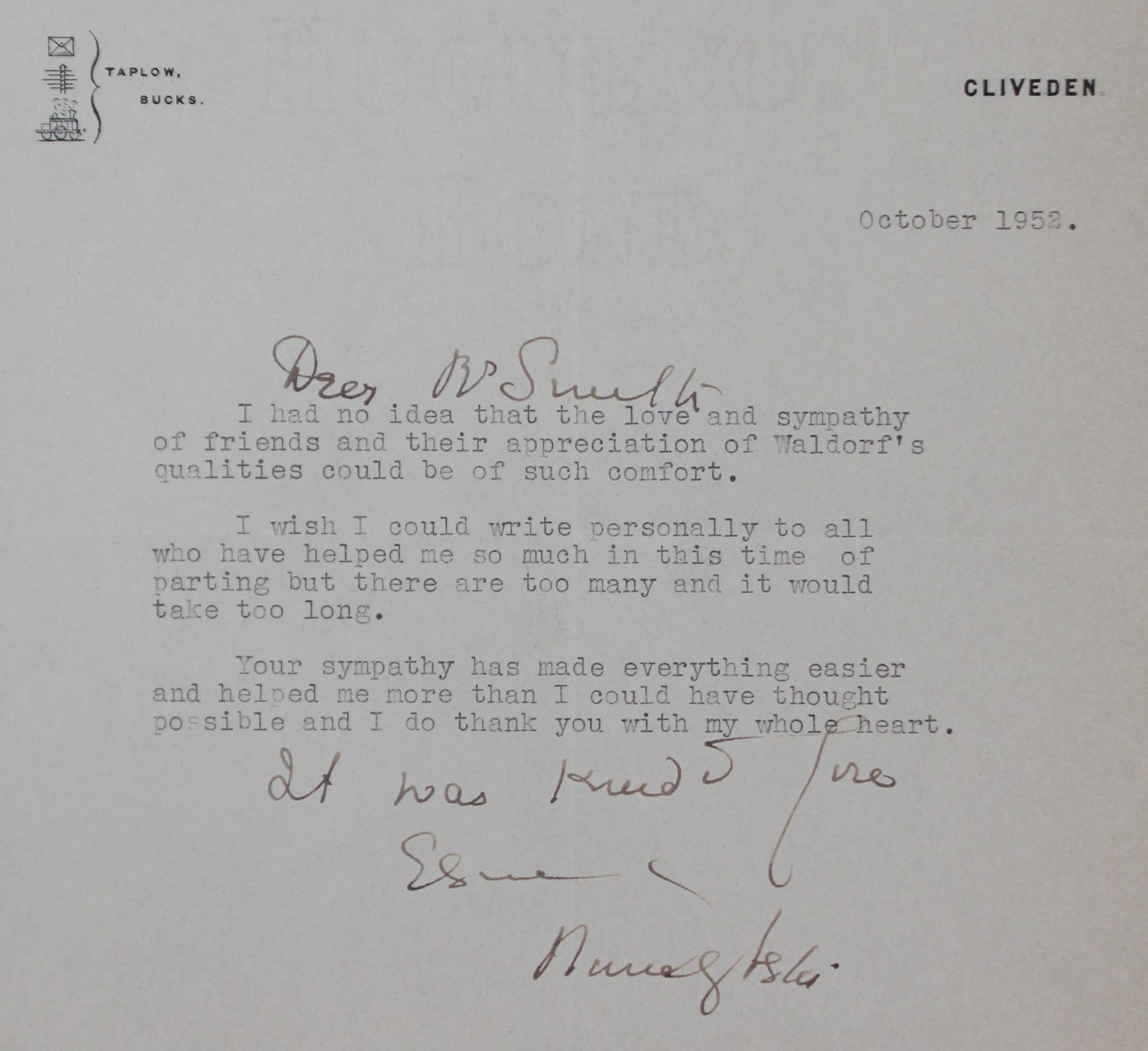 A letter addressed to Mr. Paul C. Smith ("Dear Mr. Smith"), Chief Editor of the San Francisco Chronicle. Writing on the occasion of Waldorf Astor's death she writes, in part: