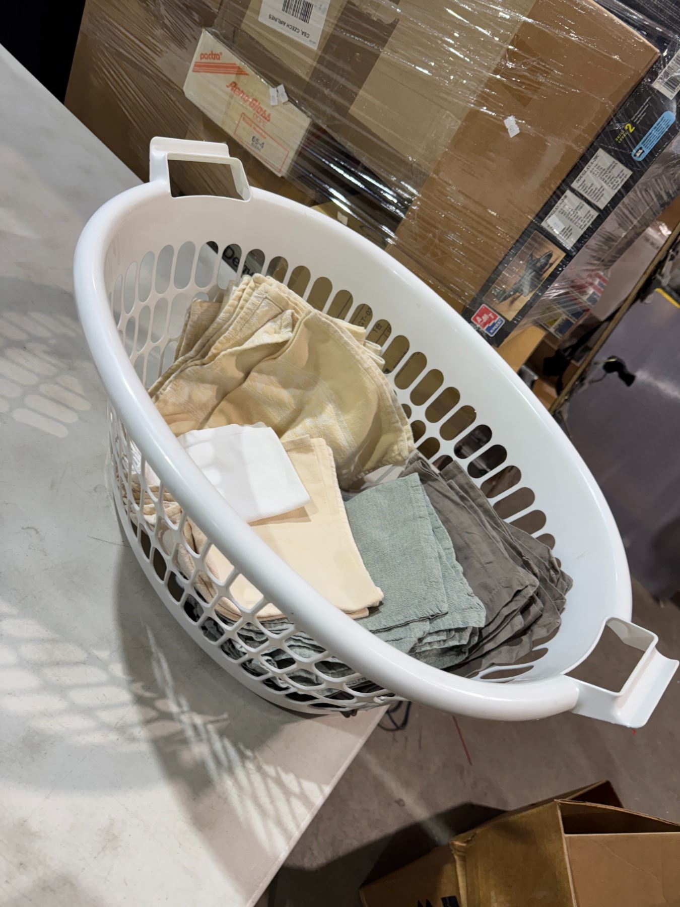 Napkins and other linens and laundry basket