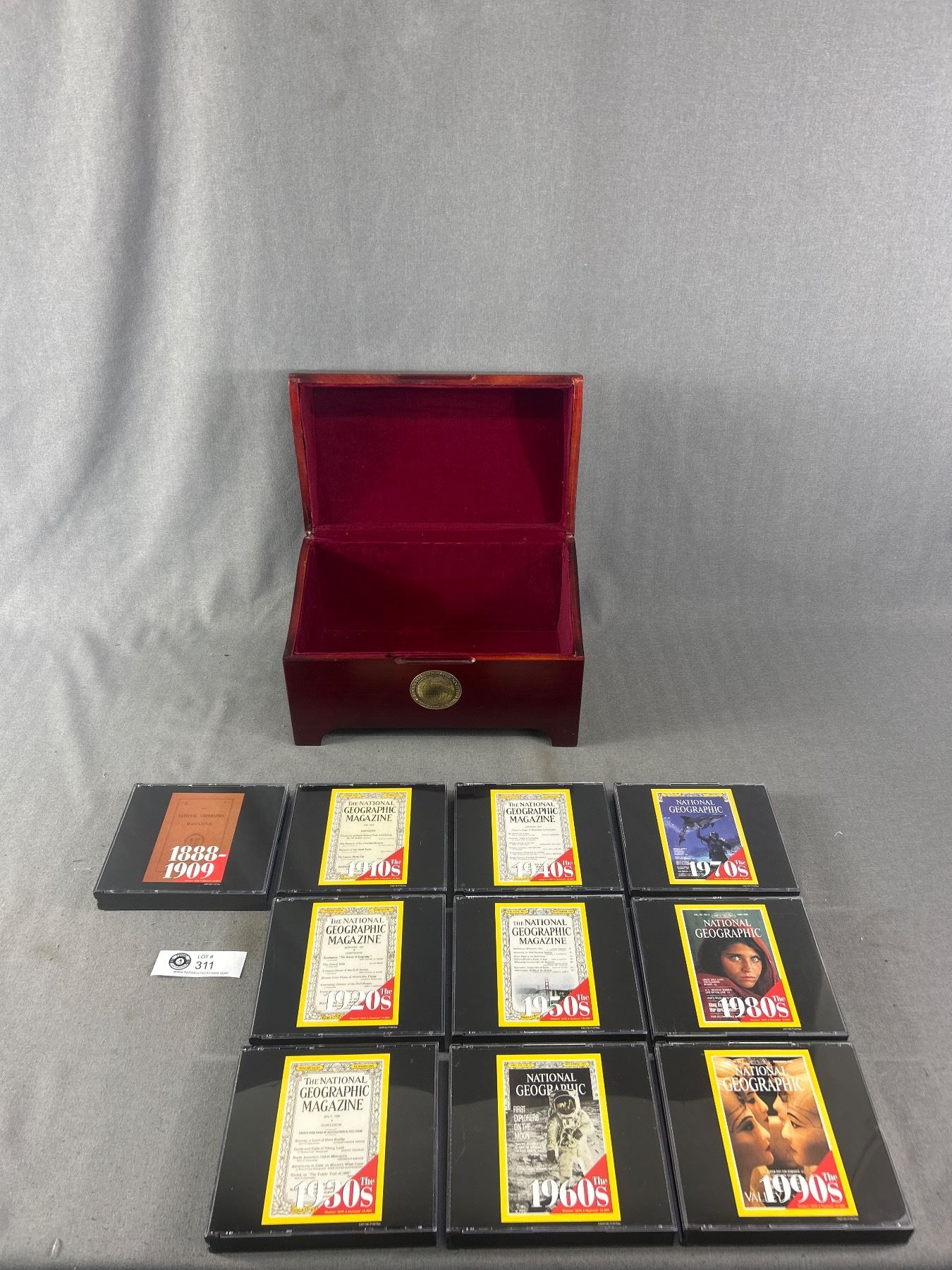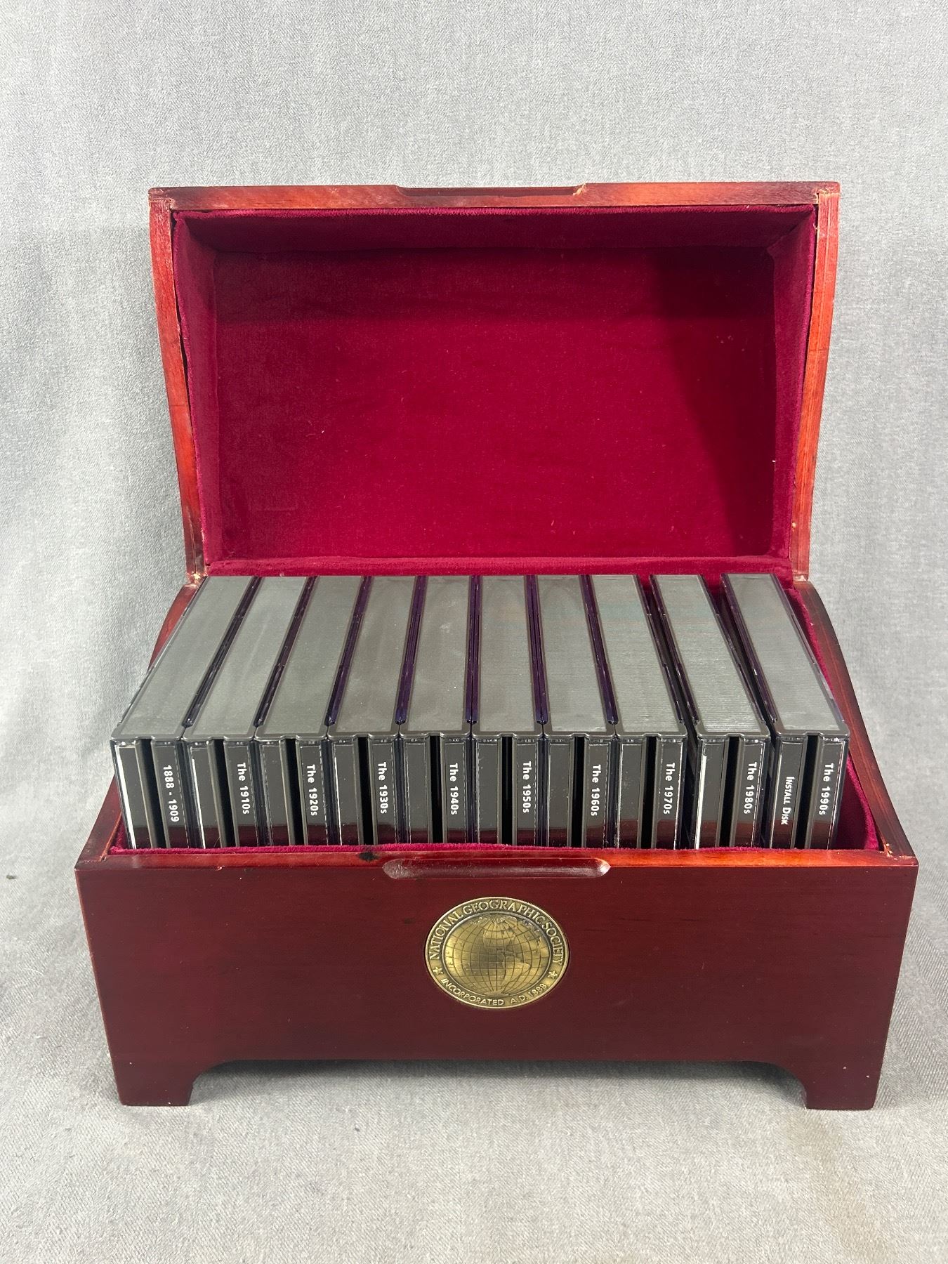 National Geographic Magazine CD Set In Beautiful Wood Storage Box. Approx. 11.25" x6.5" x7"H