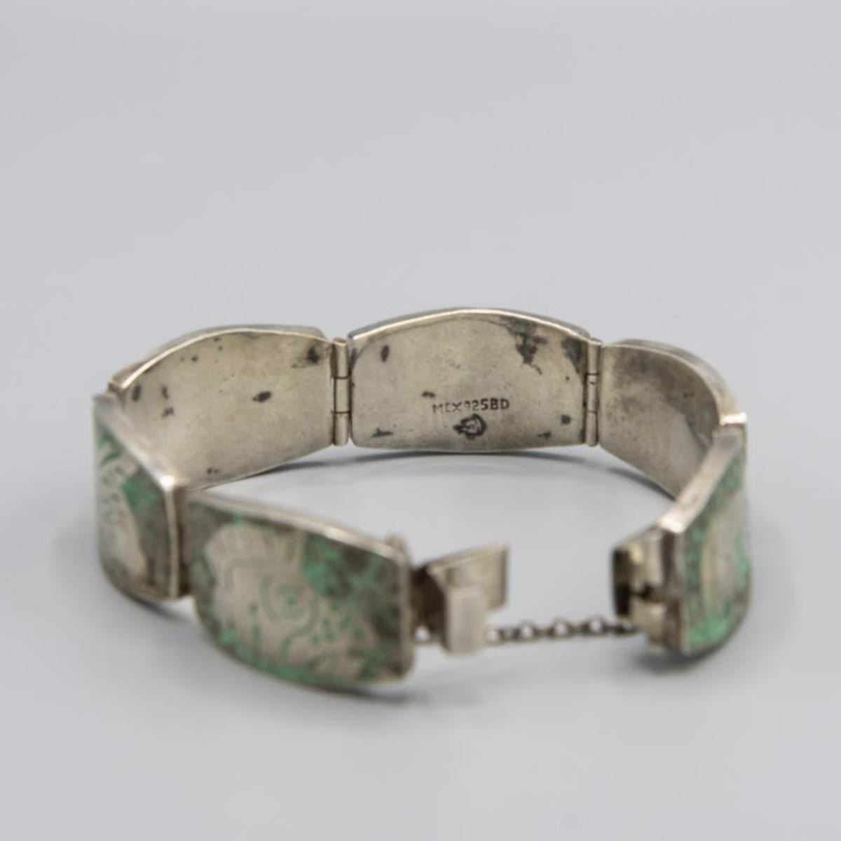 Vintage Solid.925 Sterling Silver Natural Inlayed Turquoise Bracelet.Hand crafted in Mexico with detail Aztec Silver Symbols.231.5 Cttw or 46.3 total gram weight. Approx 7 to 8 " long. Very rare and unique.