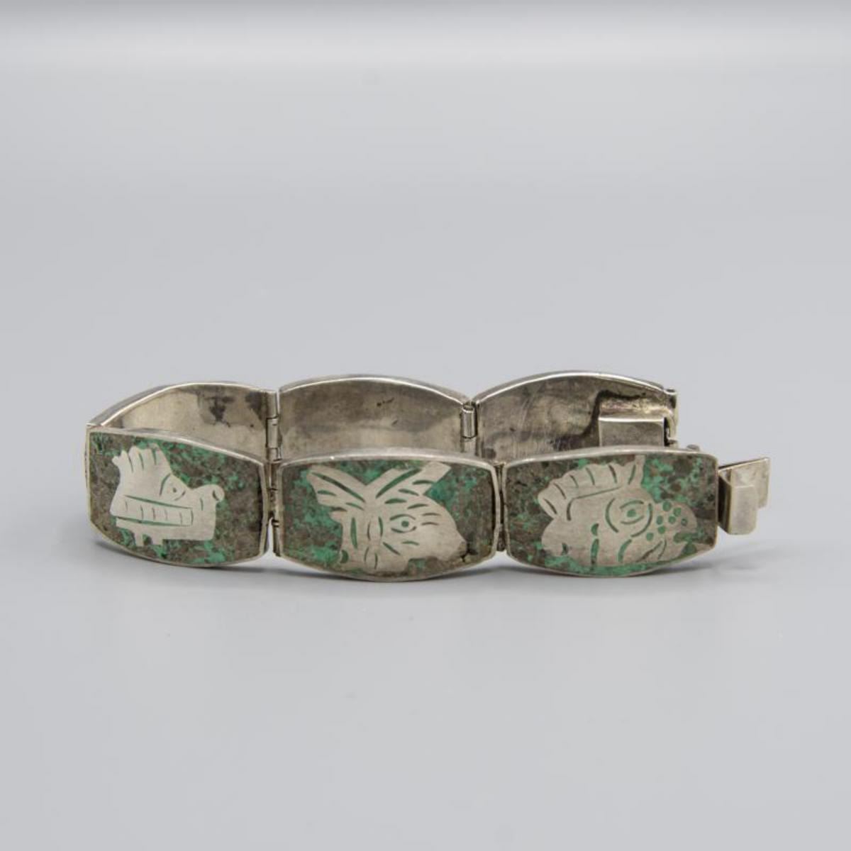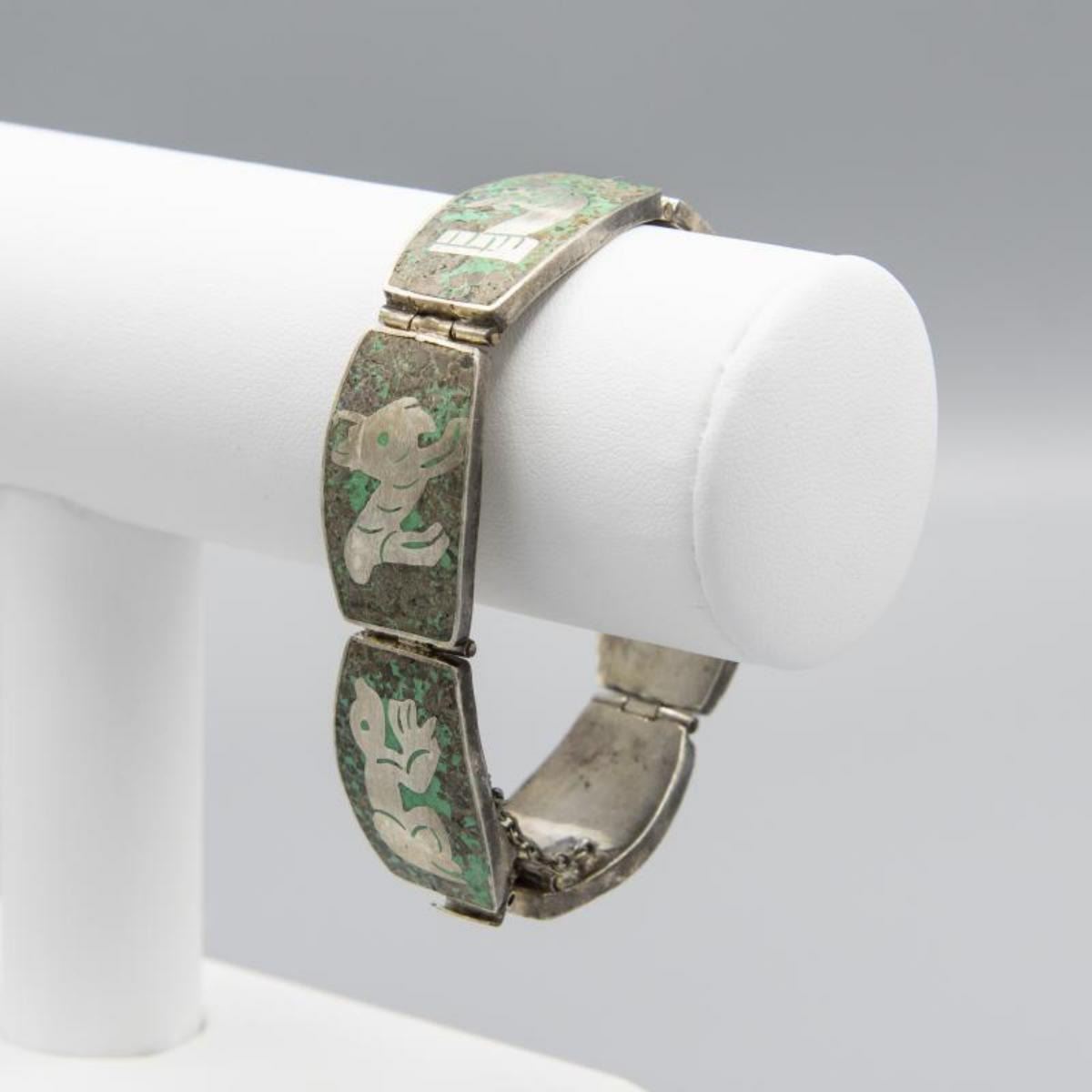 Vintage Solid.925 Sterling Silver Natural Inlayed Turquoise Bracelet.Hand crafted in Mexico with detail Aztec Silver Symbols.231.5 Cttw or 46.3 total gram weight. Approx 7 to 8 " long. Very rare and unique.