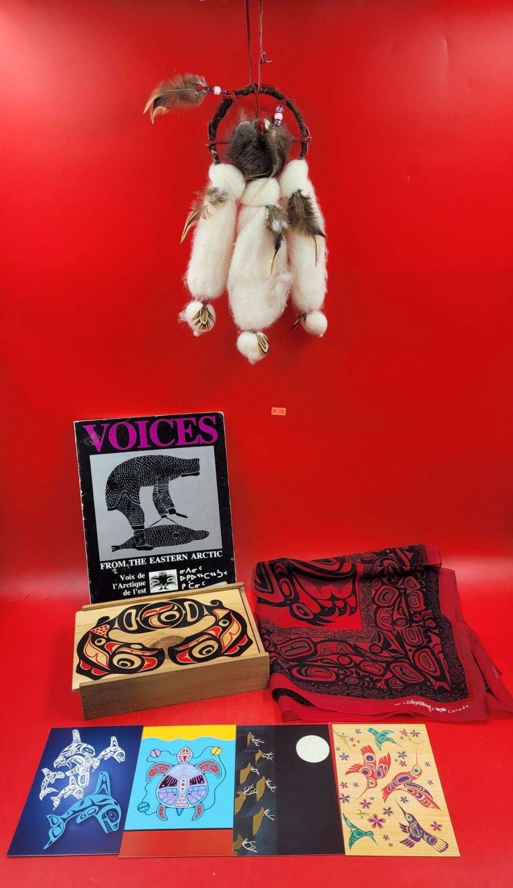 Native Art Lot w/ Dreamcatcher, 1997 Signed Scarf, Postcards, Lidded Box, & Book