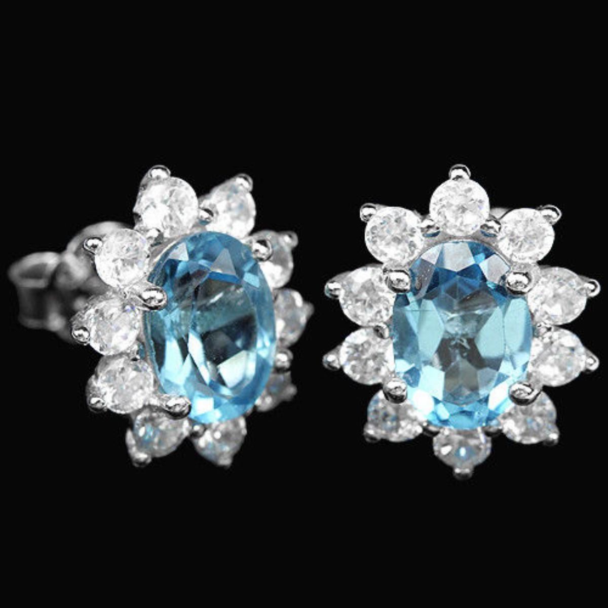 GENUINE SWISS BLUE TOPAZ & WHITE CZ 925 SILVER EARRING 14K WHITE GOLD COATING; STONE SHAPEOVALSTONE DIMENSION7 X 5 MM.ITEM WEIGHT1.8 GRAMCOLORSWISS BLUECLARITYIF - VVSLUSTERDAZZLINGTREATMENTIRRADIATIONORIGIN OF STONEAFRICAHARDNESS8.0FACE OF EARRING 12 X 10 MM. WHITE CUBIC ZIRCONIA 2 MM.