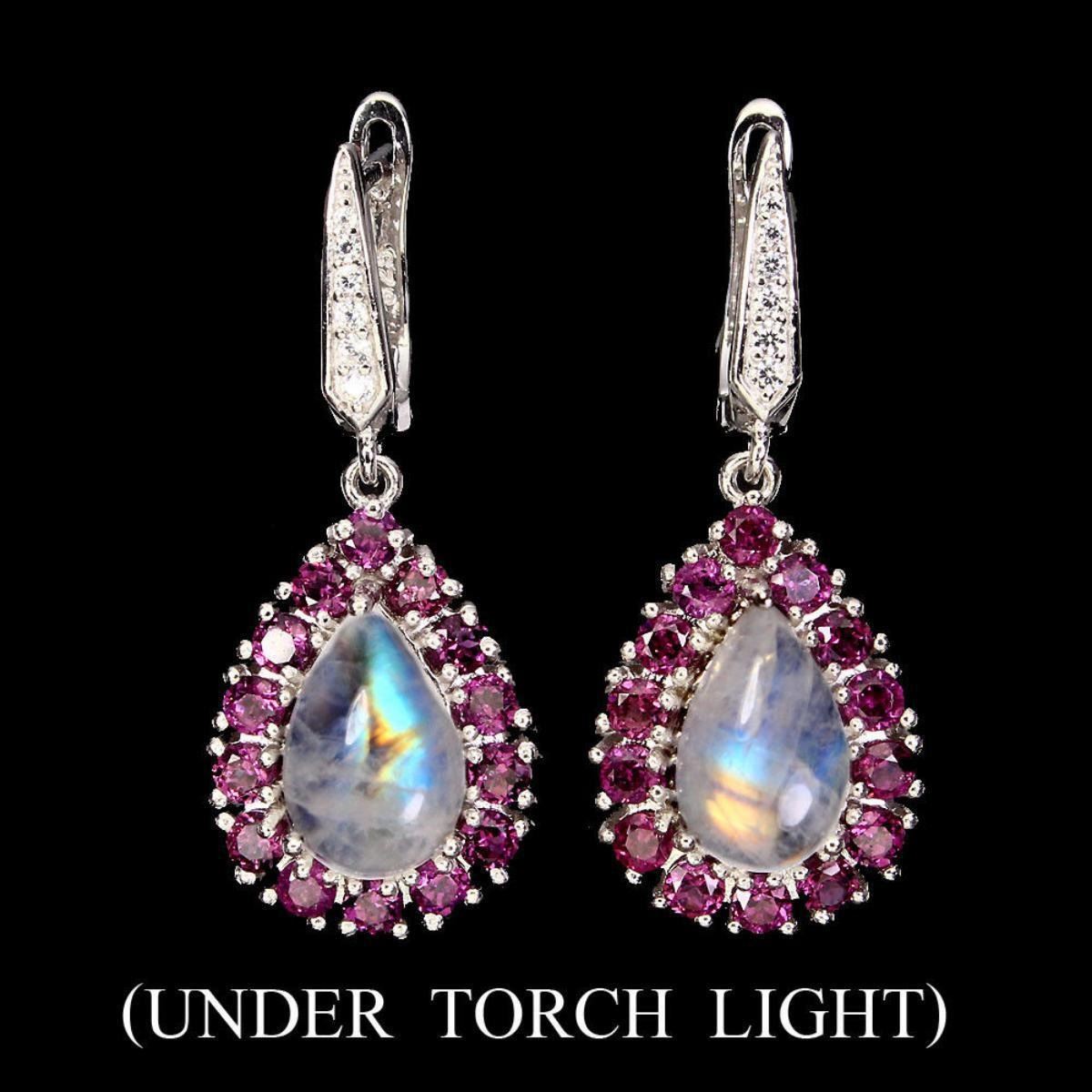 925 STERLING SILVER;PLATE-BLACK RHODIUM;MAIN STONEMOONSTONE;OTHER GEMSCUBIC ZIRCONIA,RHODOLITE GARNET;TOTAL WEIGHT41.95 CT (TOTAL WEIGHT OF SILVER + STONE)DIMENSION* STONE 2.5 TO 12.0 X 8.0 MM. * CZ 1.0 TO 1.5 MM. * FACE EARRINGS 36.0 X 14.0 MM.;MAIN STONE SHAPEPEAR CABOCHON;MAIN STONE COLORWHITE WITH FIRE BLUE LUSTER;CLARITY/GRADETRANSPARENT;LUSTERGORGEOUS;TREATMENTUNHEATED;HARDNESS5.5 - 7.5;