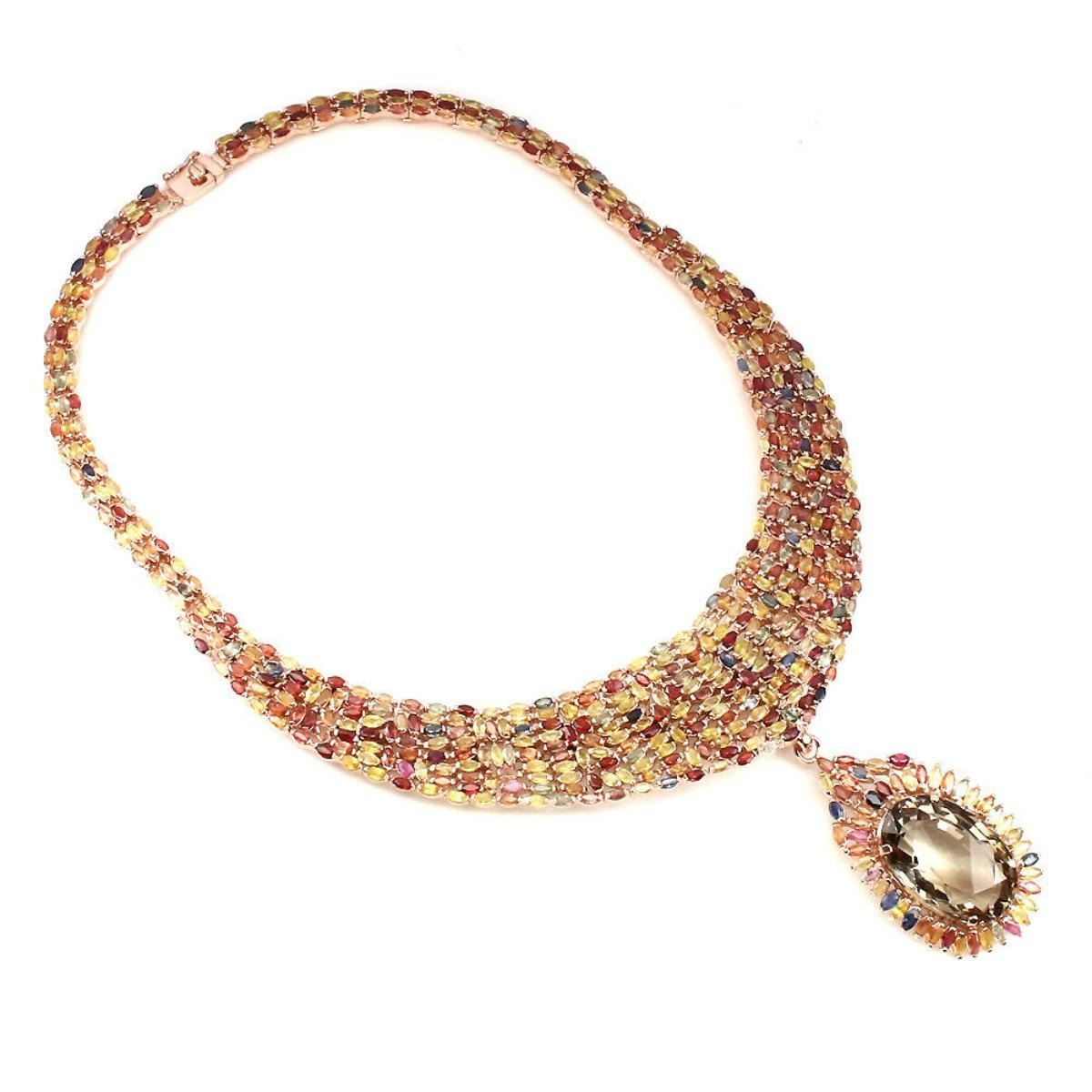 925 STERLING SILVER;PLATE14K ROSE GOLD;LENGTH (INCHES)18;MAIN STONESMOKY QUARTZ;OTHER GEMSRUBY,& SAPPHIRE;TOTAL WEIGHT557.94 CT (TOTAL WEIGHT OF SILVER + STONE)DIMENSION* STONE 4.0 X 2.0 TO 28.0 X 18.0 MM. * STONES PART LENGTH 431.0 X 84.0 MM.;MAIN STONE SHAPEOVAL CUT;MAIN STONE COLORTOP SMOKY;CLARITY/GRADEIF;TREATMENT-UNHEATED;ORIGINBRAZIL, Africa & Ceylone;HARDNESS7.0 - 9.0