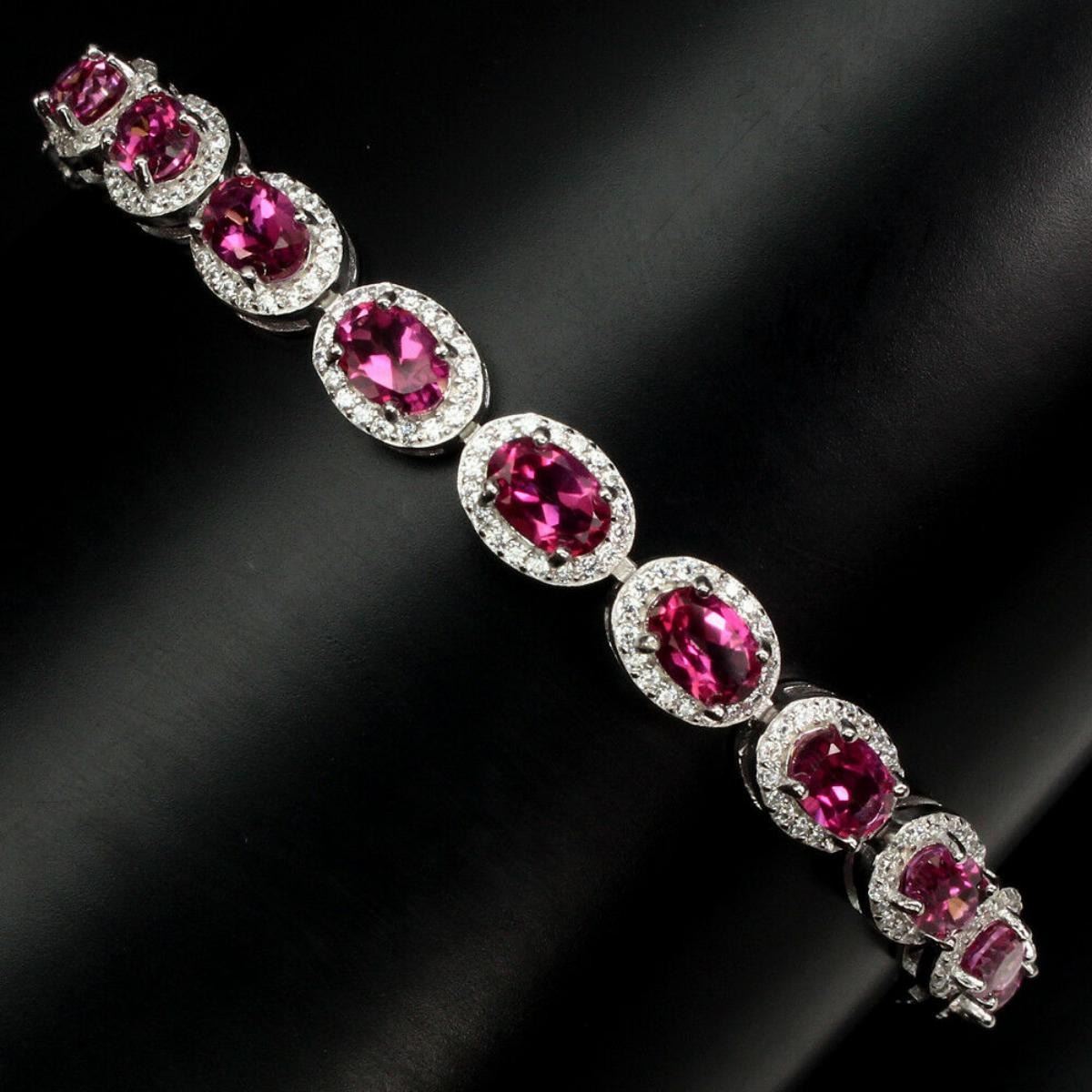 925 STERLING SILVER;PLATE14K WHITE GOLD;LENGTH (INCHES)7;MAIN STONEPINK TOPAZ;OTHER GEMSCUBIC ZIRCONIA;TOTAL WEIGHT60.83 CT (TOTAL WEIGHT OF SILVER + STONE)DIMENSION* STONE 6.0 X 4.0 MM. * CZ 1.0 MM. * FACE BRACELET 163.0 X 6.0 MM.;MAIN STONE SHAPEOVAL CUT;MAIN STONE COLORAAA PINK;CLARITY/GRADEIF;LUSTEREXQUISITE;TREATMENTHEATED TREATED;ORIGINBRAZIL;HARDNESS8.0;