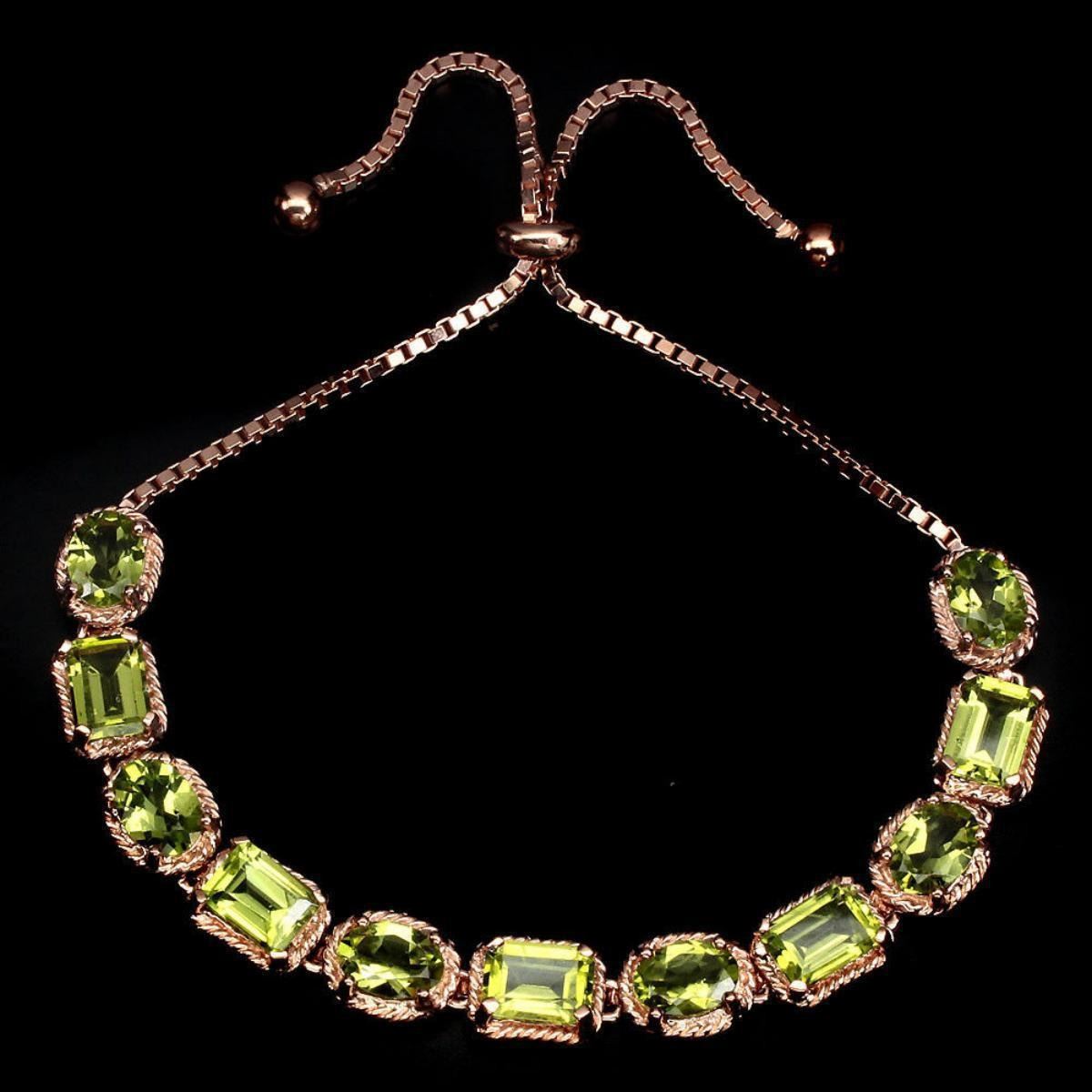 925 STERLING SILVER;PLATE14K ROSE GOLD;LENGTH (INCHES)10;MAIN STONEPERIDOT;TOTAL WEIGHT57.70 CT (TOTAL WEIGHT OF SILVER + STONE)DIMENSION* STONE 7.0 X 5.0 MM. * FACE BRACELET 105.0 X 8.0 MM.MAIN STONE SHAPEOCTAGON CUTMAIN STONE COLORTOP RICH GREENCLARITY/GRADEIF TO VVSLUSTERGORGEOUSTREATMENTUNHEATEDORIGINPAKISTANHARDNESS6.5 - 7.0