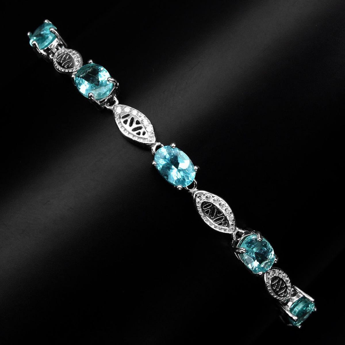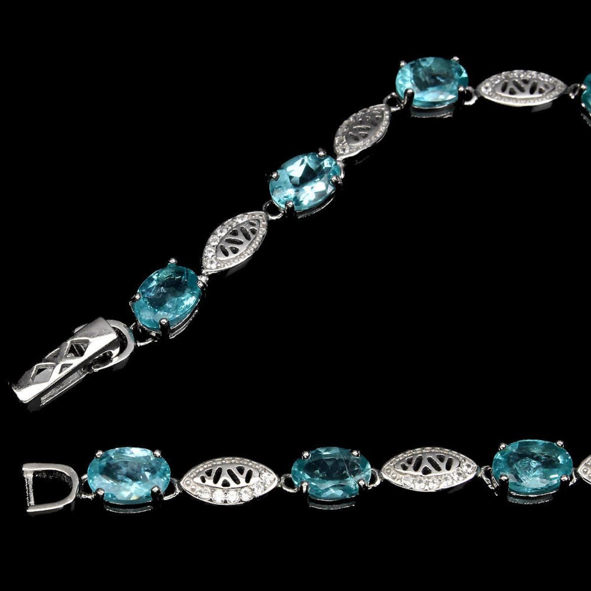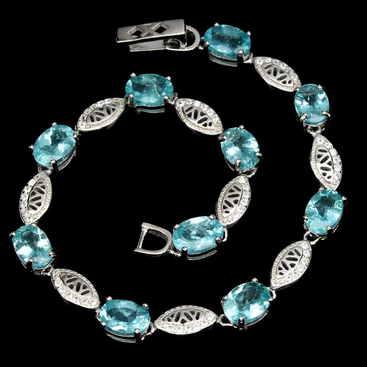 925 STERLING SILVER;PLATE...14K WHITE GOLD;LENGTH (INCHES)8;MAIN STONEAPATITEOTHER GEMSCUBIC ZIRCONIATOTAL WEIGHT46.03 CT (TOTAL WEIGHT OF SILVER + STONE)DIMENSION* STONE 7.0 X 5.0 MM. * CZ 1.0 MM. * FACE BRACELET 177.0 X 5.0 MM.MAIN STONE SHAPEOVAL CUTMAIN STONE COLORTOP NEON BLUECLARITY/GRADEIF TO VVSLUSTERRAVISHINGORIGINBrazilHARDNESS5