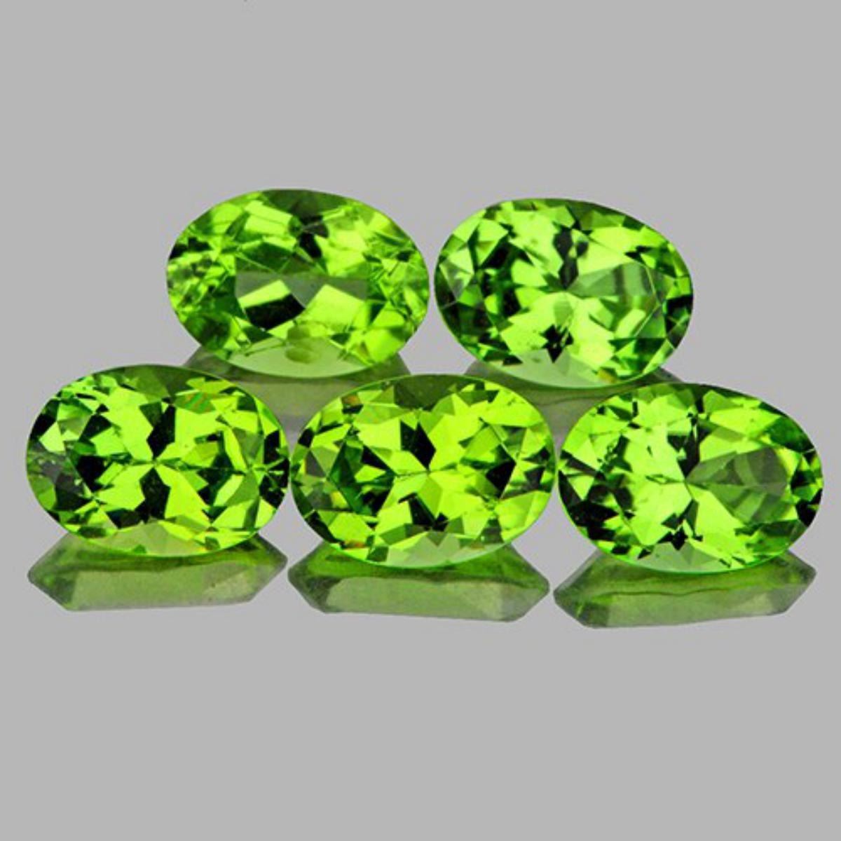 Natural Peridot WEIGHT : 3.82 cts; SHAPE : Oval; SIZE ( L x W x D ) : 7.00 x 5.00 mm; QUANTITY : 5 pieces ( Perfectly Matched Set ) COLOR : AAA Green Best Color ; CLARITY : Flawless-VVS1 (BEST QUALITY) ORIGIN : PAKISTAN; HARDNESS : 7; LUSTER : Excellent!!! TREATMENT : UNHeated;
