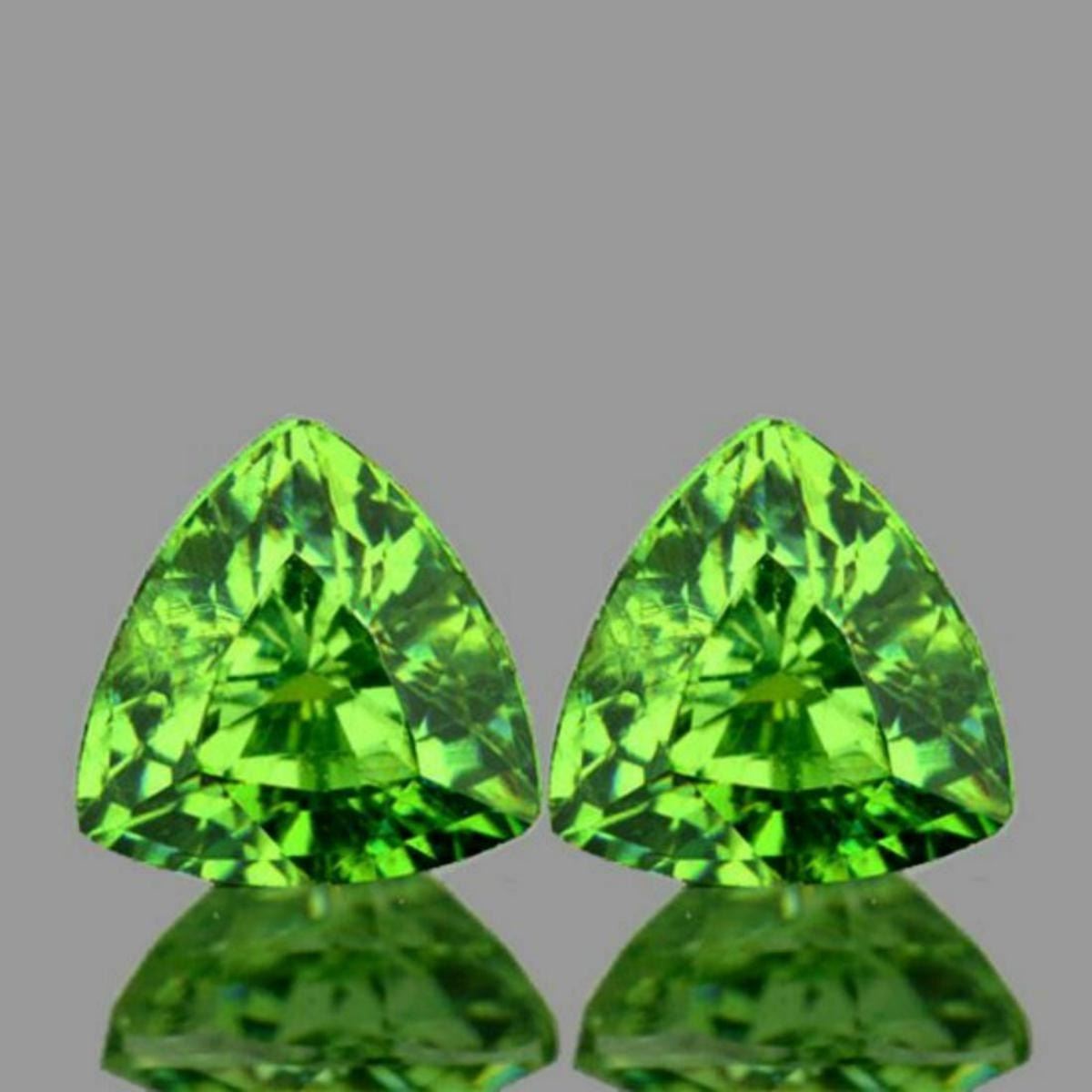 Natural Demantoid; SHAPE : Trilliant SIZE ( L x W x D ) : 5.00 mm; QUANTITY : 2 pieces (Perfectly Matched Pair) COLOR : Premium Green AAA Color; CLARITY : Flawless-VVS1 AAA Grade; ORIGIN : Ural Mountains , Russia; HARDNESS : 7; LUSTER : Excellent!!! TREATMENT : 100% Natural Unheated;