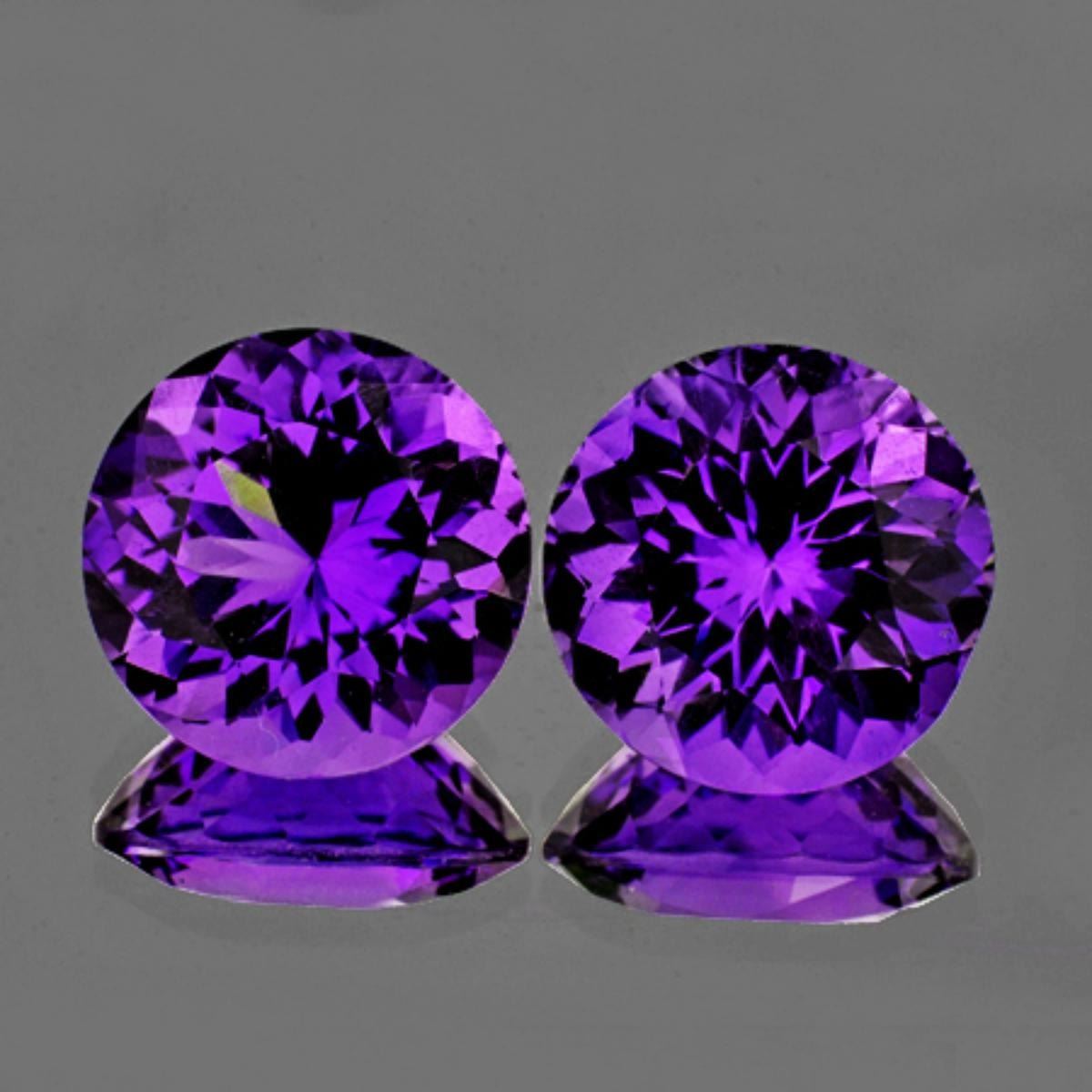 Natural Amethyst WEIGHT : 14.40 cts; SHAPE : Round (Portuguese Cut) SIZE ( L x W x D ) : 12.50 mm; QUANTITY : 2 pieces (Perfect Matching Pair) COLOR : Intense Purple AAA Color; CLARITY : Flawless-VVS1 AAA Grade; ORIGIN : Uruguay; HARDNESS : 7; LUSTER : Excellent!!! TREATMENT : 100% Natural Unheated;