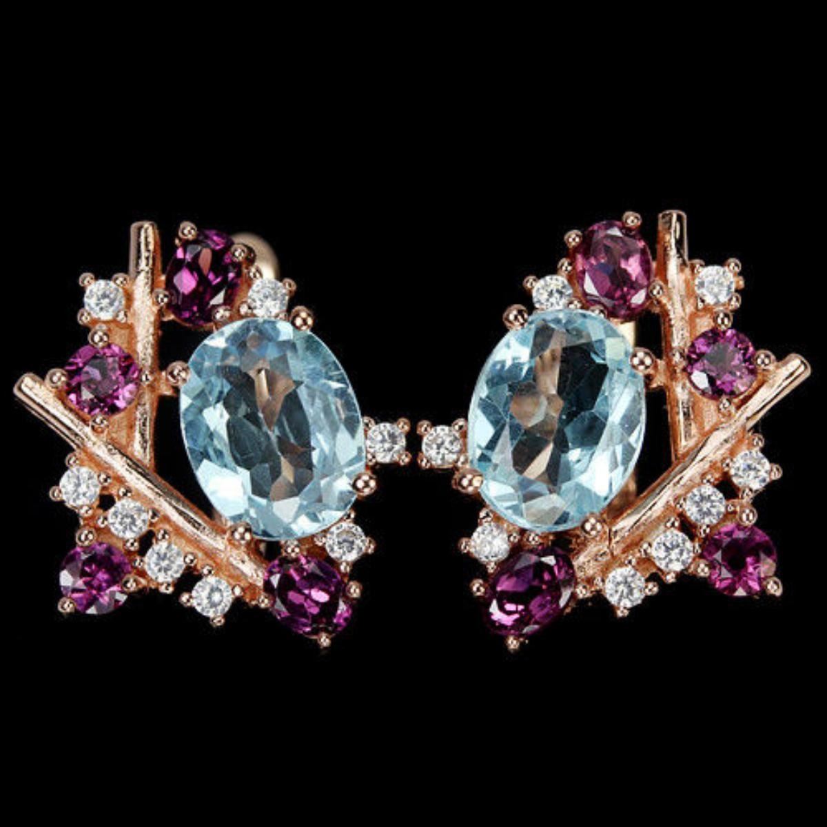 GENUINE SKY BLUE TOPAZ RHODOLITE & CZ 925 SILVER EARRING 14K WHITE GOLD COATING; STONE SHAPEOVAL & ROUND PORTUGESE CUTSTONE DIMENSION9 X 7 MM. , 4 X 3 MM. & 3 MM.ITEM WEIGHT7 GRAMCOLORAAA SKY BLUE & PINK RASPBERRYCLARITYIF - VVSLUSTERDAZZLINGTREATMENTIRRADIATION & UNHEATEDORIGIN OF STONEAFRICAHARDNESS7.5 - 8.0;FACE OF EARRING 19 X 16 MM. WHITE CUBIC ZIRCONIA 1.7 MM.