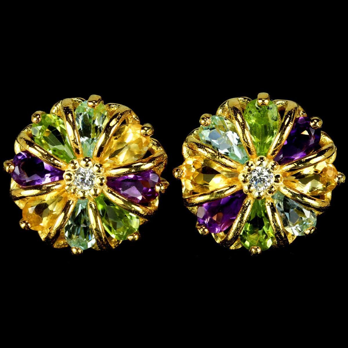Natural AMETHYST TOPAZ CITRINE PERIDOT Earrings; Main stone size:5 X 3 mm.;Dimension Of Item W x L (mm.):14 X 14 mm.Total Carat Weight (TCW):20.5;Metal Purity:.925 sterling silver with 14k yellow gold plated;Main Stone Shape:PearMain Stone: AMETHYST TOPAZ CITRINE PERIDOT;Main Stone Creation: Natural untreated ;Style:Stud;