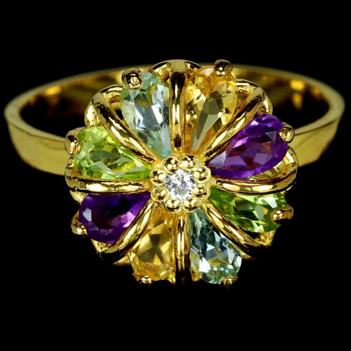 Natural AMETHYST TOPAZ CITRINE PERIDOT Ring; Metal Purity:925 sterling silver with 14k gold plated;Ring Shape:Flower;Main stone size:5 X 3 mm;Dimension Of Item W x L (mm.):13 X 13 mm.;Ring Size:8.25(resizeable);Main Stone:Topaz;Total Carat Weight (TCW):16.0;ring Sizable:Yes;Main Stone Shape:Pear;