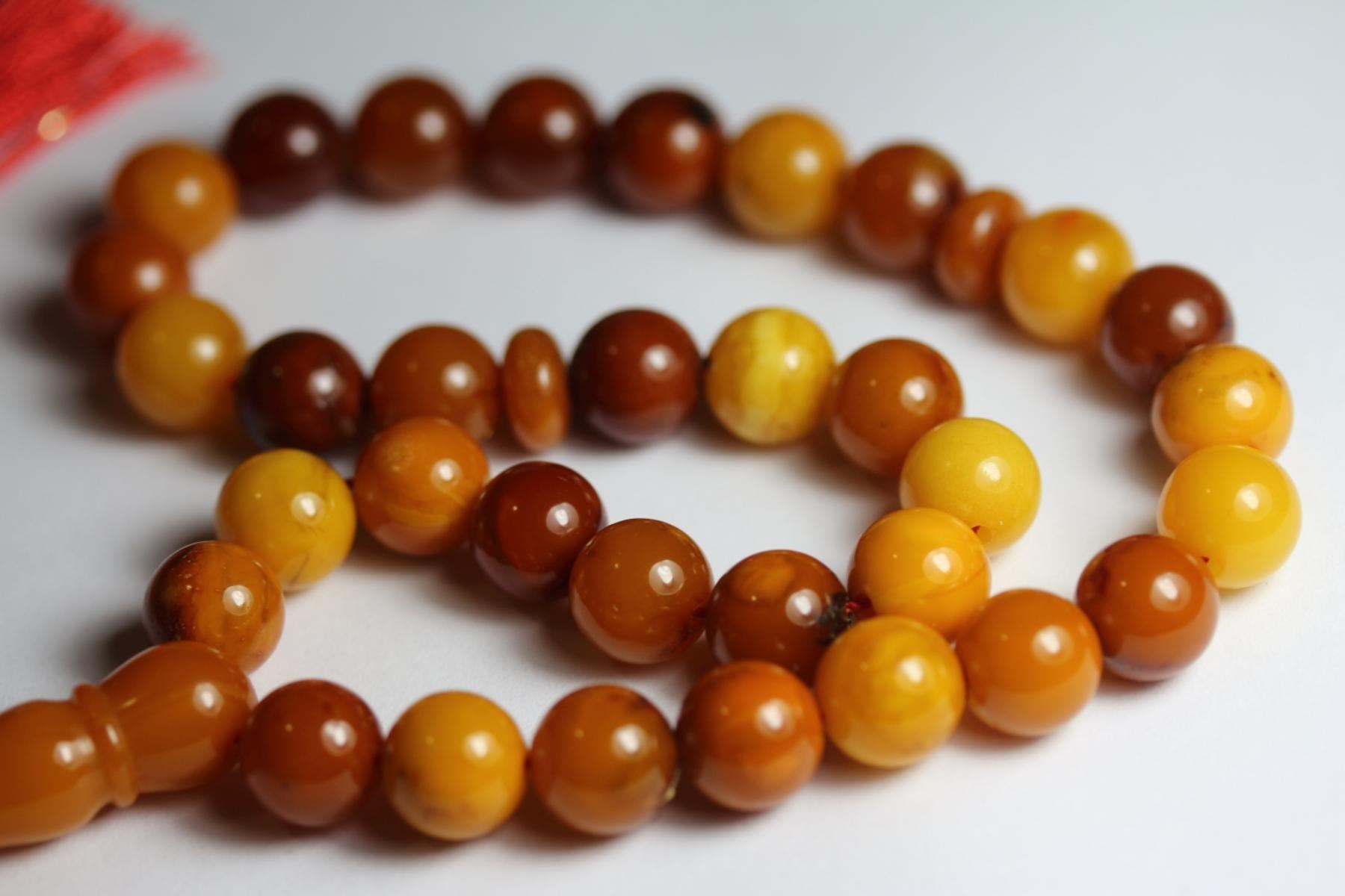 Natural Amber Islamic Prayer 33 Beads Tasbih.....Description: Excellent vintage style genuine Baltic amber Islamic 33 prayer made of round shape beads.Size: It weighs 21 grams. Diameter of round beads is 10 mm. Length ~ 16.1" (41cm).