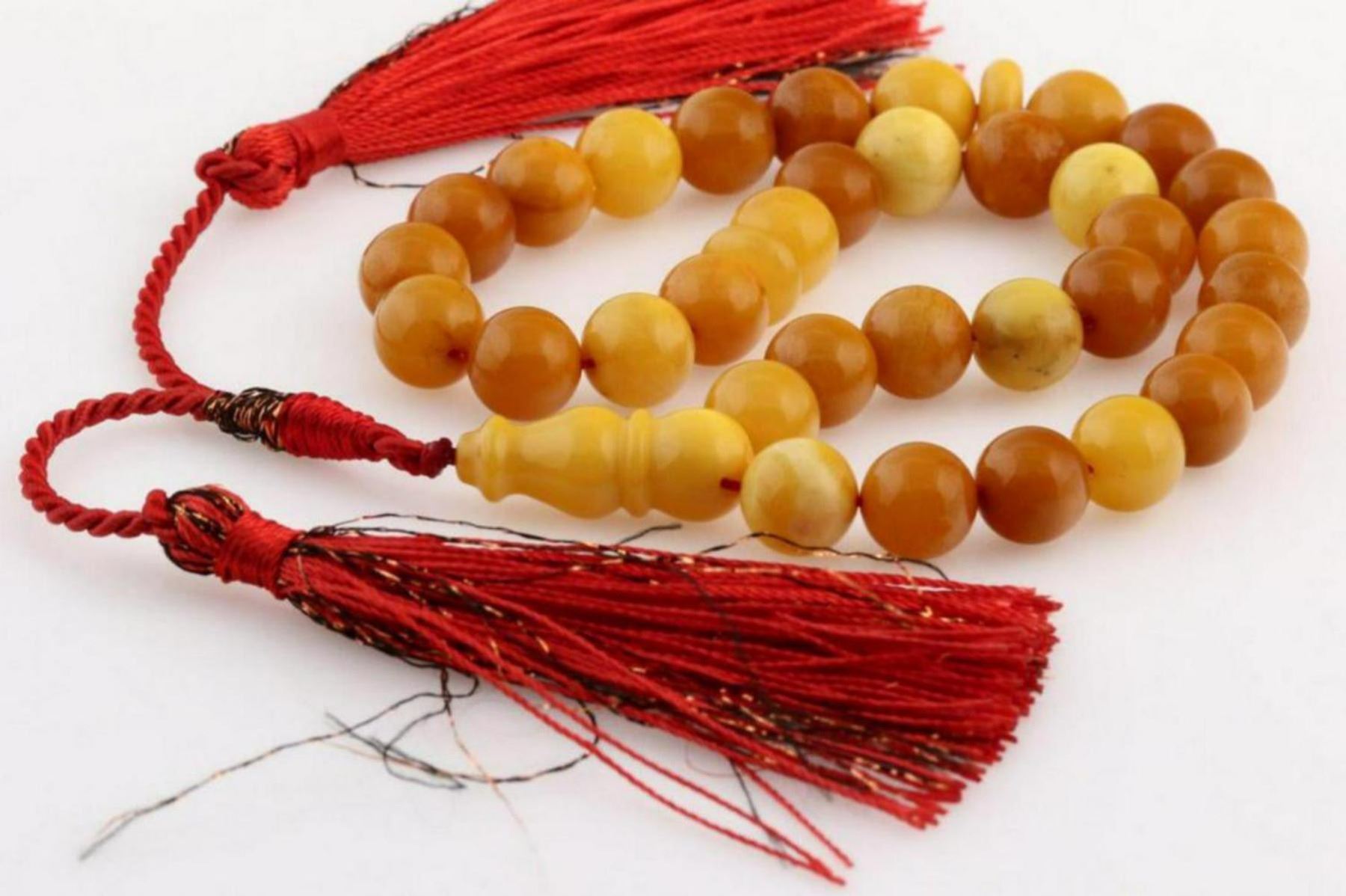 Excellent vintage style genuine natural amber Islamic 33 prayer made of round shape beads.Size: It weighs 16 grams. Diameter of round beads is 8 mm. Length ~ 12.4" (32cm).Color: Butterscotch, egg yolk;About amber: Amber, as it has been attracting attention of people from remote times, is called Lithuanian gold. It is valued as a marvelous adornment because it reminds of warm sunshine. Ladies used to wear it with a great pleasure in ancient Rome and in the Medieval Ages in West Europe and Asia. Nowadays it is also fashionable and is being worn widely. Maybe because it is easy grind and polished nevertheless it as hard as a stone.All amber we sell is Genuine, Authentic, and Natural Baltic Amber. It is not artificial, plastic, and synthetic, reconstituted or substitute for amber. All items are made by trusted and experienced manufacturers which are in amber business already for 20 years.