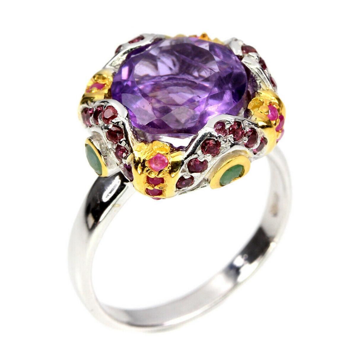 925 STERLING SILVER;PLATE-14K WHITE GOLD;RING SIZE-9(resizeable)MAIN STONE-AMETHYST;OTHER GEMS-EMERALD, RHODOLITE GARNET, RUBY;TOTAL WEIGHT-6.88 GRAM (TOTAL WEIGHT OF SILVER + STONE)DIMENSION* STONE 1.5 TO11.0 MM. * RING SIZE 8.0 * FACE RING 17.0 X 16.0 MM.;MAIN STONE SHAPE-ROUND CUT;MAIN STONE COLOR-TOP RICH PURPLE;CLARITY/GRADE-IF TO VVS;TREATMENT-UNHEATED;ORIGIN-BRAZIL;HARDNESS-7;