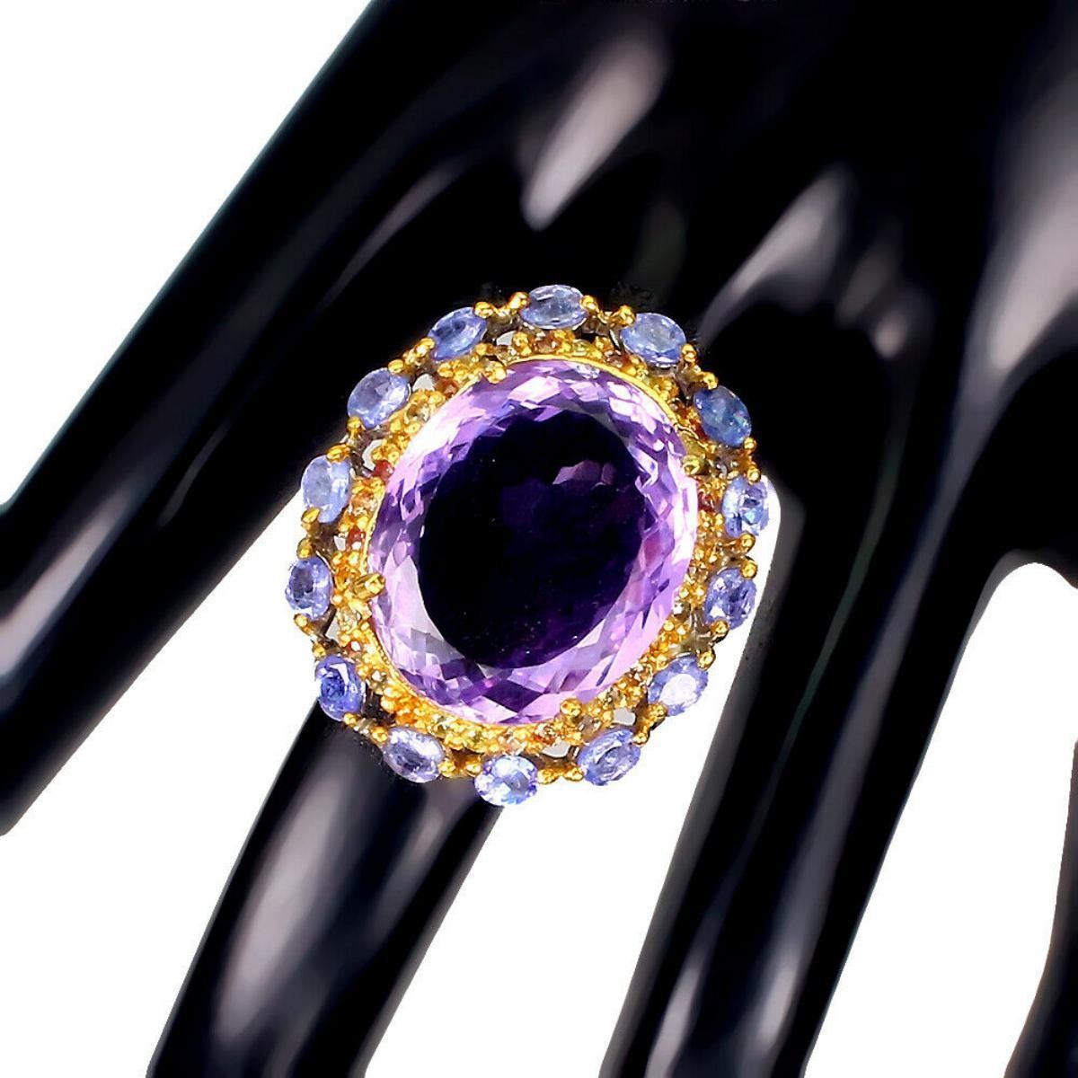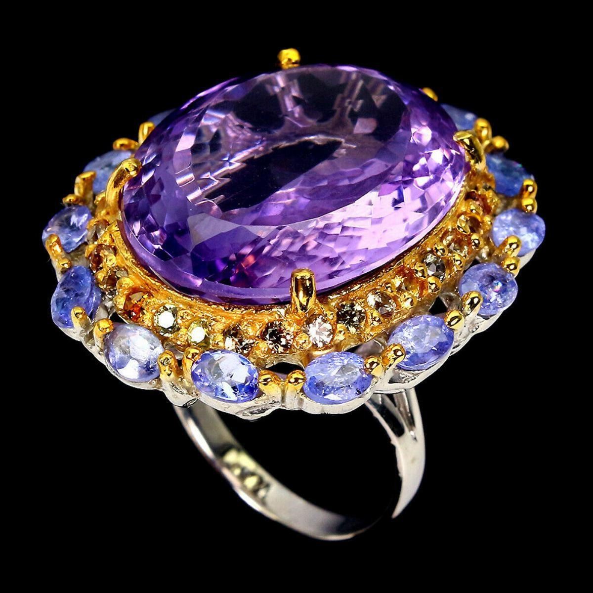 925 STERLING SILVER;PLATE-2-TONE WHITE & YELLOW 14K GOLD;RING SIZE/resizeable-7.5;MAIN STONE-AMETHYST;OTHER GEMS-SAPPHIRE, TANZANITE;TOTAL WEIGHT-13.41 GRAM (TOTAL WEIGHT OF SILVER + STONE)DIMENSION-* STONE 2.0 TO 22.0 X 18.0 MM. * RING SIZE 7.5 * FACE RING -31.0 X 27.0 MM.;MAIN STONE SHAPE-OVAL CUT;MAIN STONE COLOR-TOP RICH PURPLE;CLARITY/GRADE-IF;TREATMENT-UNHEATED;ORIGIN-BRAZIL;HARDNESS-7;
