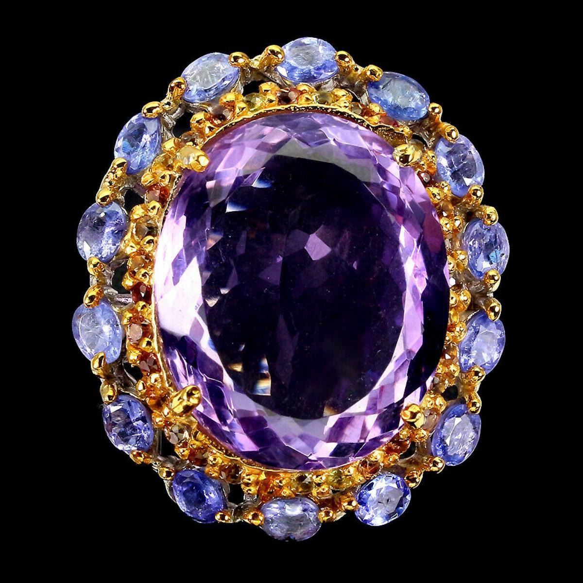 925 STERLING SILVER;PLATE-2-TONE WHITE & YELLOW 14K GOLD;RING SIZE/resizeable-7.5;MAIN STONE-AMETHYST;OTHER GEMS-SAPPHIRE, TANZANITE;TOTAL WEIGHT-13.41 GRAM (TOTAL WEIGHT OF SILVER + STONE)DIMENSION-* STONE 2.0 TO 22.0 X 18.0 MM. * RING SIZE 7.5 * FACE RING -31.0 X 27.0 MM.;MAIN STONE SHAPE-OVAL CUT;MAIN STONE COLOR-TOP RICH PURPLE;CLARITY/GRADE-IF;TREATMENT-UNHEATED;ORIGIN-BRAZIL;HARDNESS-7;