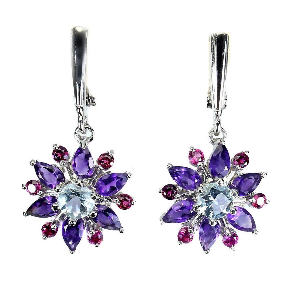 925 STERLING SILVER;PLATE-14K WHITE GOLDMAIN STONE-AMETHYST;OTHER GEMS-AQUAMARINE, RHODOLITE GARNET;TOTAL WEIGHT-5.34 GRAM (TOTAL WEIGHT OF SILVER + STONE);DIMENSION- * STONE 2.0 TO 5.0 X 3.0 MM.* FACE EARRINGS 33.0 X 16.0 MM.;MAIN STONE SHAPE-PEAR;MAIN STONE COLOR-PURPLE;CLARITY/GRADE-IF TO VVS;TREATMENT-UNHEATED;ORIGIN-BRAZIL;HARDNESS-7;