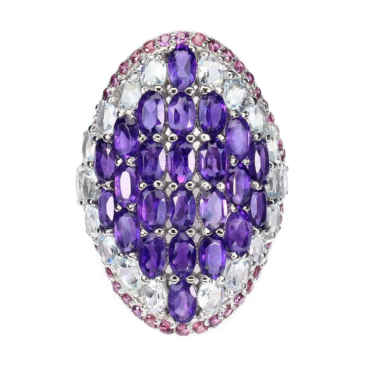 925 STERLING SILVER;PLATE14K WHITE GOLD;RING SIZE/resizable-9;MAIN STONE-AMETHYSTOTHER GEMS-AQUAMARINE, RHODOLITE GARNETTOTAL WEIGHT-8.81 GRAM (TOTAL WEIGHT OF SILVER + STONE)DIMENSION-* STONE 1.5 TO 5.0 X 3.0 MM. * RING SIZE 9.0 * FACE RING -34.0 X 24.0 MM.;MAIN STONE SHAPE-OVAL CUT;MAIN STONE COLOR-TOP RICH PURPLE;CLARITY/GRADE-IF TO VVS;TREATMENT-UNHEATED;Origin - Brazil;HARDNESS-7;