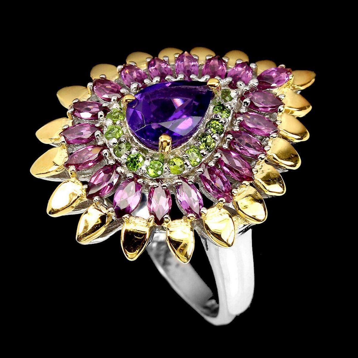 925 STERLING SILVER;PLATE-2-TONE WHITE & YELLOW 14K GOLD;RING SIZE/(resizeable)8;MAIN STONE-AMETHYST;OTHER GEMS-CHROME DIOPSIDE, RHODOLITE GARNET;TOTAL WEIGHT-7.43 GRAM (TOTAL WEIGHT OF SILVER + STONE)DIMENSION-* STONE 1.0 TO 8.0 X 6.0 MM. * RING SIZE 8.0 * FACE RING 27.0 X 22.0 MM.;MAIN STONE SHAPE-PEAR CUT;MAIN STONE COLOR- PURPLE;CLARITY/GRADE-IF TO VVS;TREATMENT-UNHEATED;ORIGIN-BRAZIL;HARDNESS-7;