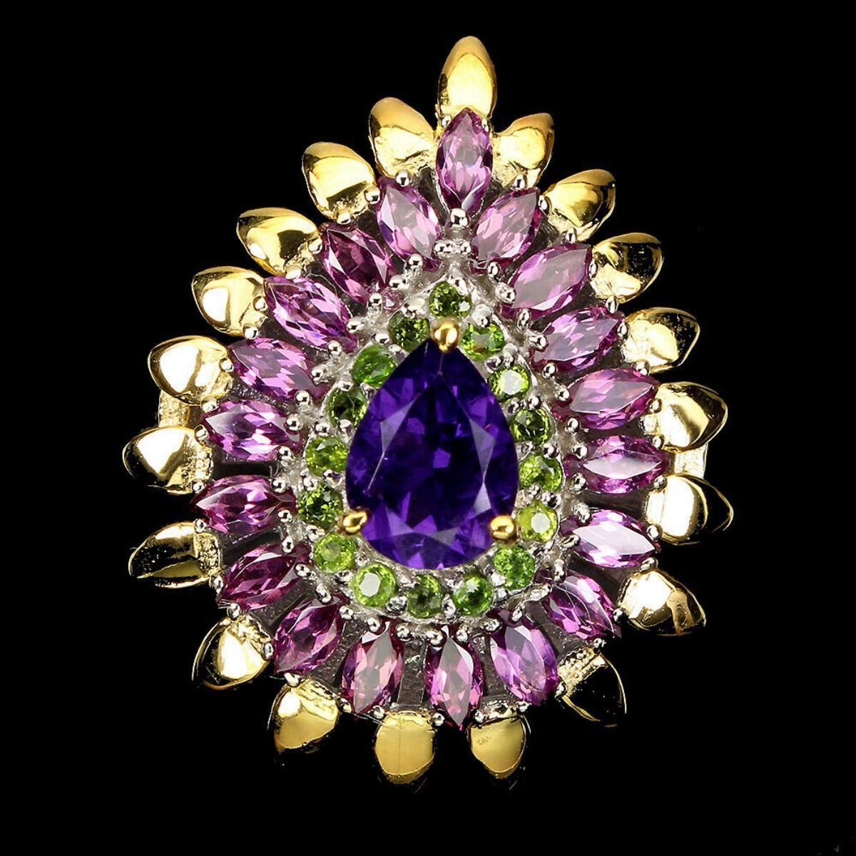 925 STERLING SILVER;PLATE-2-TONE WHITE & YELLOW 14K GOLD;RING SIZE/(resizeable)8;MAIN STONE-AMETHYST;OTHER GEMS-CHROME DIOPSIDE, RHODOLITE GARNET;TOTAL WEIGHT-7.43 GRAM (TOTAL WEIGHT OF SILVER + STONE)DIMENSION-* STONE 1.0 TO 8.0 X 6.0 MM. * RING SIZE 8.0 * FACE RING 27.0 X 22.0 MM.;MAIN STONE SHAPE-PEAR CUT;MAIN STONE COLOR- PURPLE;CLARITY/GRADE-IF TO VVS;TREATMENT-UNHEATED;ORIGIN-BRAZIL;HARDNESS-7;