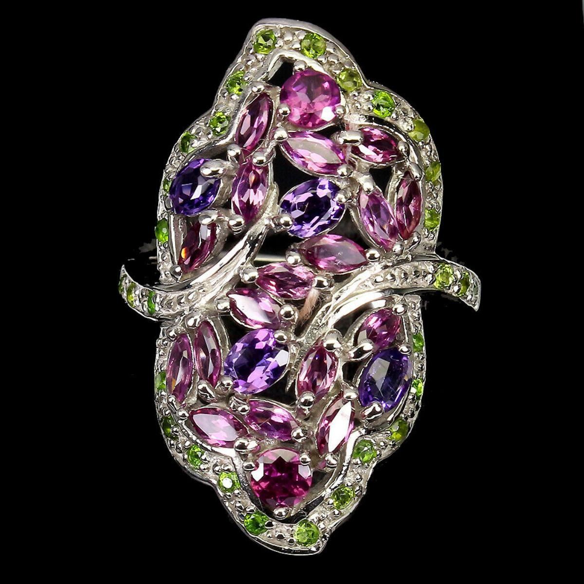 925 -STERLING SILVER;PLATE14K WHITE GOLD;RING SIZE/resizeable-8.5;MAIN STONE-AMETHYST;OTHER GEMS-CHROME DIOPSIDE, RHODOLITE GARNET;TOTAL WEIGHT-5.63 GRAM (TOTAL WEIGHT OF SILVER + STONE)DIMENSION-* STONE 1.0 TO 4.0 X 3.0 MM. * RING SIZE 8.5 * FACE RING 31.0 X 21.0 MM.;MAIN STONE SHAPE-OVAL CUT;MAIN STONE COLOR-TOP INTENSE PURPLE;CLARITY/GRADE-IF TO VVS;TREATMENT-UNHEATED;ORIGIN-BRAZIL;HARDNESS-7;