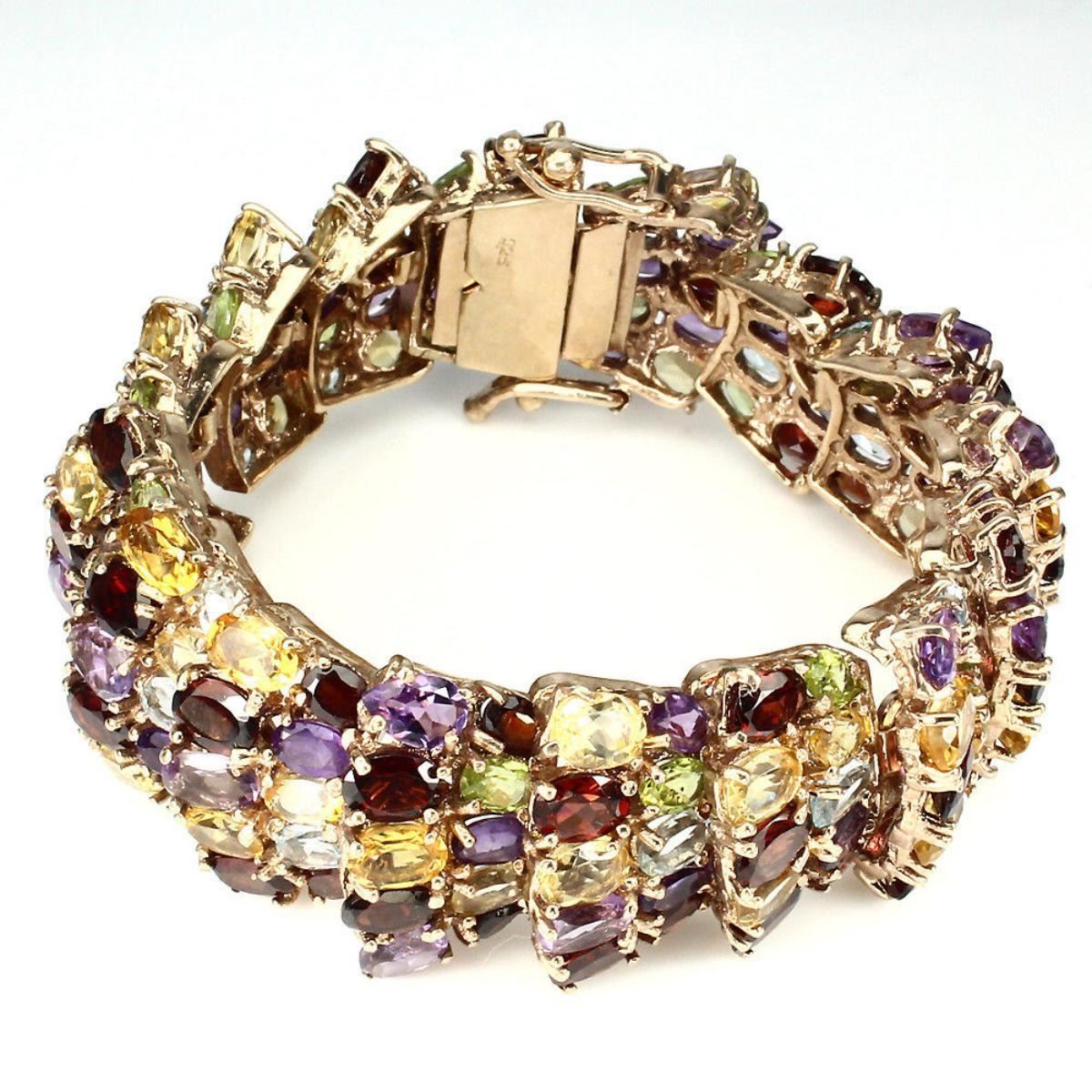 925 STERLING SILVER;PLATE.....14K ROSE GOLD;LENGTH (INCHES)8.5; Gems-AMETHYST,CITRINE,MOZAMBIQUE GARNET,PERIDOT,SKY BLUE TOPAZ;TOTAL WEIGHT447.57 CT (TOTAL WEIGHT OF SILVER + STONE)DIMENSION* STONE 6.0 X 4.0 TO 8.0 X 6.0 MM. * FACE BRACELET 210.0 X 26.0 MM.MAIN STONE SHAPEOVAL CUTMAIN STONE COLORTOP RICH PURPLECLARITY/GRADEIF TO VVSLUSTERSTUNNINGTREATMENTUNHEATEDORIGINBRAZILHARDNESS7.0