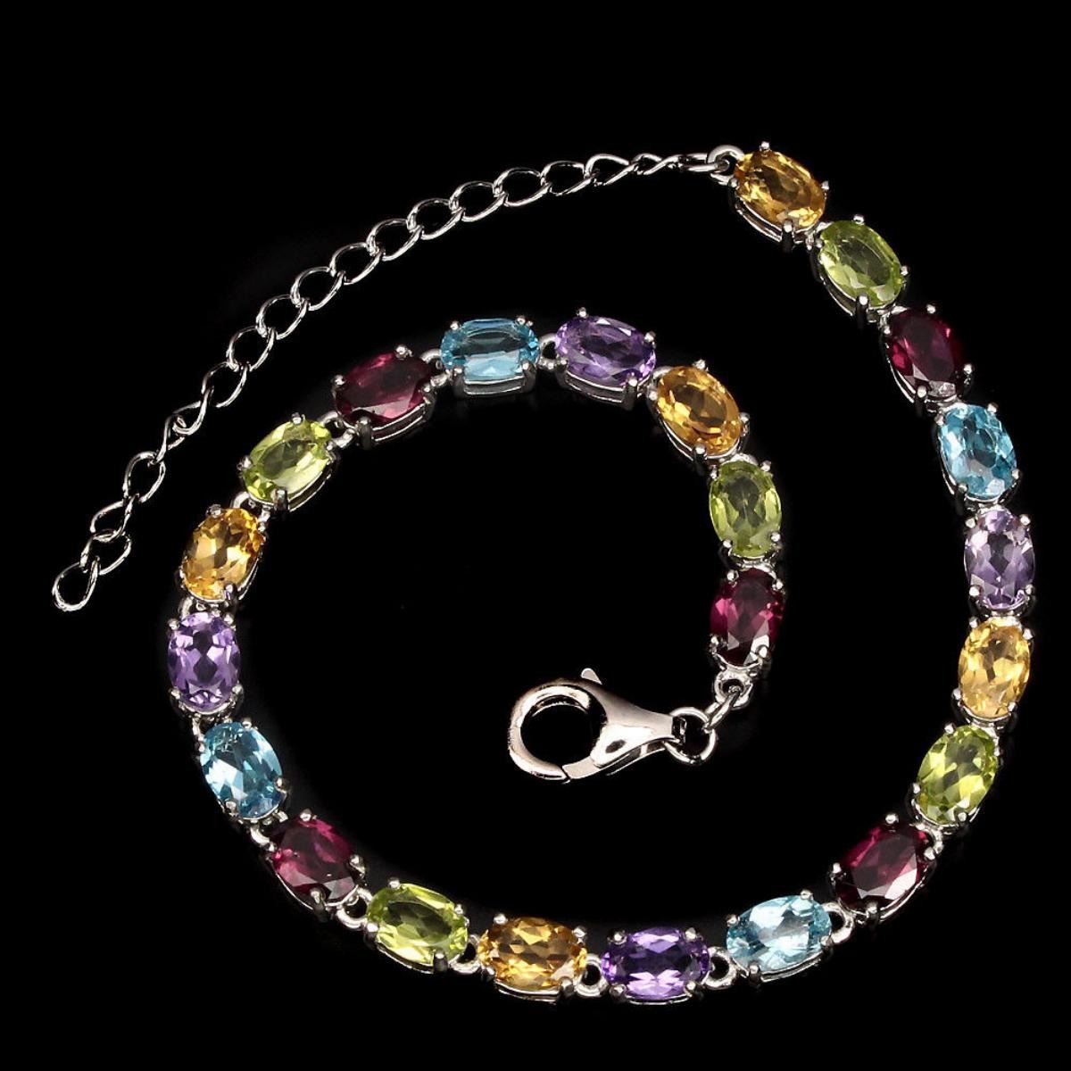 925 STERLING SILVER;PLATE14K WHITE GOLD;LENGTH (INCHES)9;MAIN STONEAMETHYSTOTHER GEMSCITRINE,PERIDOT,RHODOLITE GARNET,SWISS BLUE TOPAZTOTAL WEIGHT48.77 CT (TOTAL WEIGHT OF SILVER + STONE)DIMENSION* STONE 6.0 X 4.0 MM. * FACE BRACELET 160.0 X 4.0 MM.MAIN STONE SHAPEOVAL CUTMAIN STONE COLORTOP RICH PURPLECLARITY/GRADEIF TO VVSLUSTERRAVISHINGTREATMENTUNHEATEDORIGINBRAZILHARDNESS6.5 - 8.0