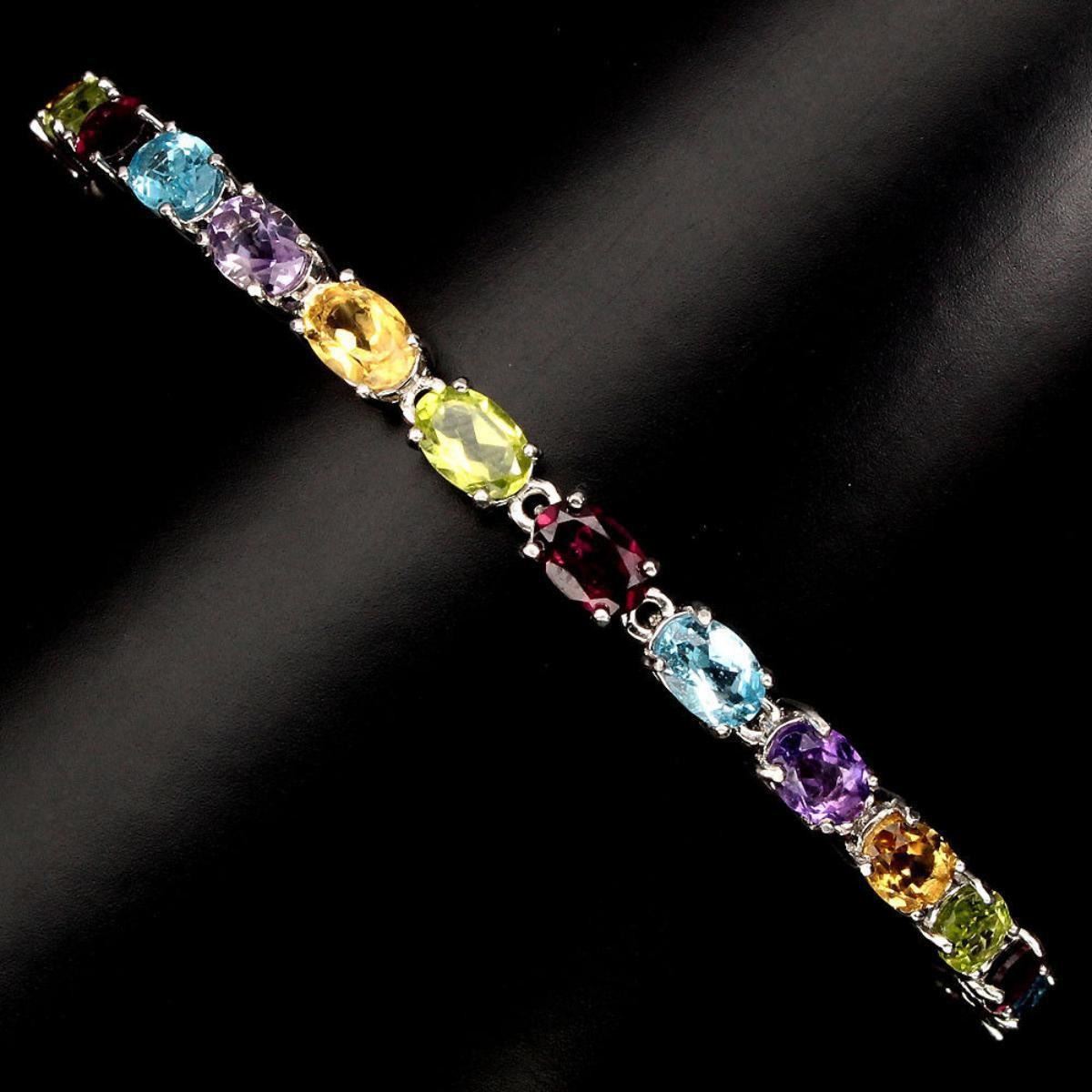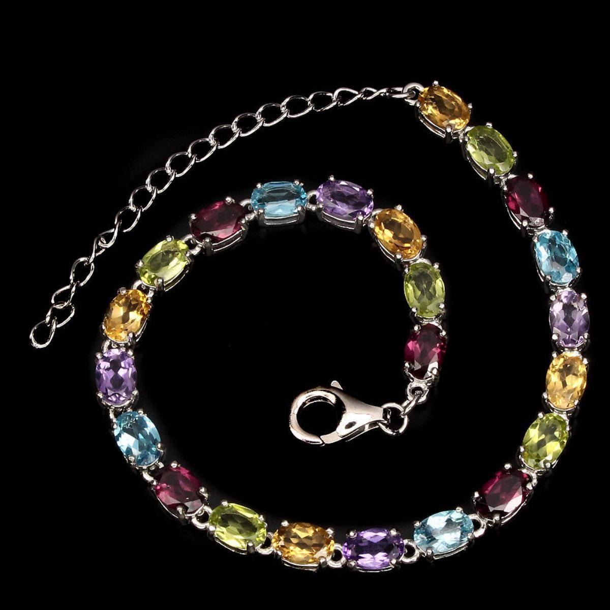 925 STERLING SILVER;PLATE14K WHITE GOLD;LENGTH (INCHES)9;MAIN STONEAMETHYSTOTHER GEMSCITRINE,PERIDOT,RHODOLITE GARNET,SWISS BLUE TOPAZTOTAL WEIGHT48.77 CT (TOTAL WEIGHT OF SILVER + STONE)DIMENSION* STONE 6.0 X 4.0 MM. * FACE BRACELET 160.0 X 4.0 MM.MAIN STONE SHAPEOVAL CUTMAIN STONE COLORTOP RICH PURPLECLARITY/GRADEIF TO VVSLUSTERRAVISHINGTREATMENTUNHEATEDORIGINBRAZILHARDNESS6.5 - 8.0