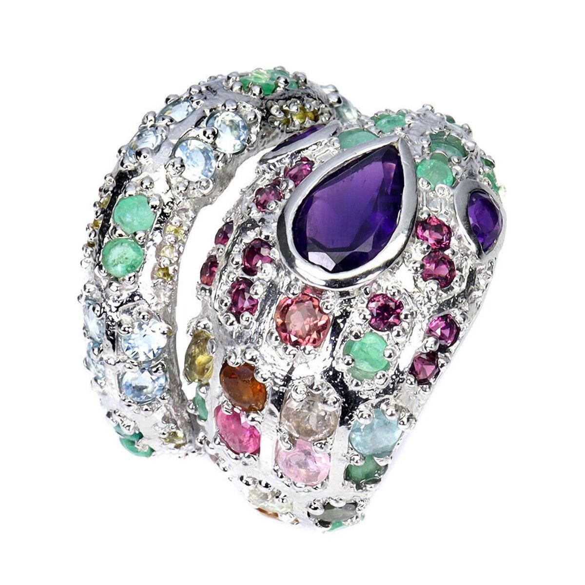 925 STERLING SILVER;PLATE-14K WHITE GOLD;RING SIZE/resizable-8;MAIN STONE-AMETHYST;OTHER GEMS-EMERALD, RHODOLITE GARNET, TOURMALINE;TOTAL WEIGHT-10.57 GRAM (TOTAL WEIGHT OF SILVER + STONE)DIMENSION-* STONE 1.0 TO 9.0 X 6.0 MM.;* FACE RING- 26.0 X 23.0 MM.;MAIN STONE SHAPE-PEAR CUT;MAIN STONE COLOR- RICH PURPLE;CLARITY/GRADE-IF TO VVS;TREATMENT-UNHEATED;ORIGIN-URUGUAY;HARDNESS-7;