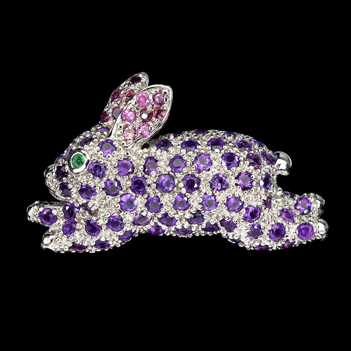 925 STERLING SILVER;PLATE-14K WHITE GOLD;MAIN STONE-AMETHYST;OTHER GEMS-EMERALD, RHODOLITE GARNET;TOTAL WEIGHT-10.59 GRAM (TOTAL WEIGHT OF SILVER + STONE)DIMENSION-* STONE 2.0 TO 2.5 MM.;* FACE BROOCH- 44.0 X 23.0 MM.;MAIN STONE SHAPE--ROUND CUT;MAIN STONE COLOR- PURPLE;CLARITY/GRADE-IF TO VVS;TREATMENT-UNHEATED;ORIGIN-URUGUAY;HARDNESS-7;