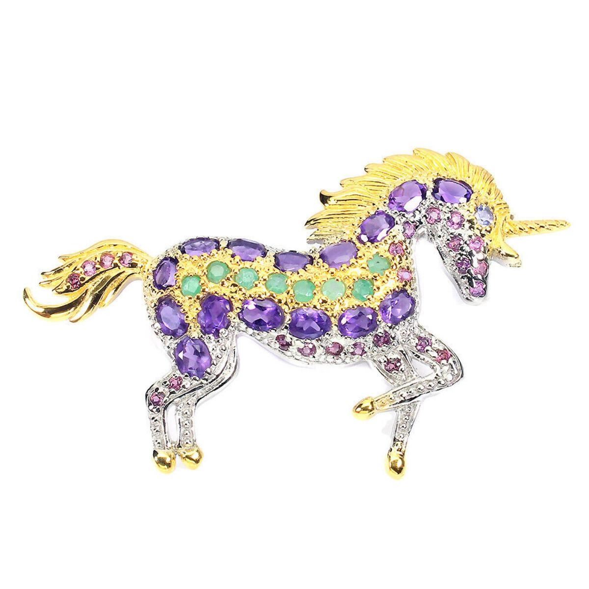 925 STERLING SILVER;PLATE-2-TONE WHITE & YELLOW 14K GOLD;MAIN STONE-AMETHYST;OTHER GEMS-EMERALD, RHODOLITE GARNET, TANZANITE;TOTAL WEIGHT-8.03 GRAM (TOTAL WEIGHT OF SILVER + STONE);DIMENSION-* STONE 1.5 TO 4.0 X 3.0 MM.* FACE BROOCH 54.0 X 33.0 MM.;MAIN STONE SHAPE-OVAL; MAIN STONE COLOR-PURPLE;CLARITY/GRADE-IF TO VVS;TREATMENT-UNHEATED;ORIGIN-URUGUAY;HARDNESS-7;