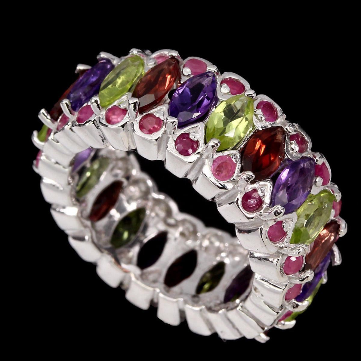 925 STERLING SILVER;PLATE14K WHITE GOLD;RING SIZE 7;MAIN STONE AMETHYST;OTHER GEMS MOZAMBIQUE GARNET,PERIDOT,RUBY;TOTAL WEIGHT 53.44 CT (TOTAL WEIGHT OF SILVER + STONE)DIMENSION* STONE 2.0 TO 6.0 X 3.0 MM. * FACE RING 26.0 X 9.0 MM.MAIN STONE SHAPEMARQUISE CUT;MAIN STONE COLORTOP RICH PURPLE;CLARITY/GRADEIF TO VVS;LUSTERPRECIOUS;TREATMENTUNHEATED;ORIGINBRAZIL;HARDNESS7.0;