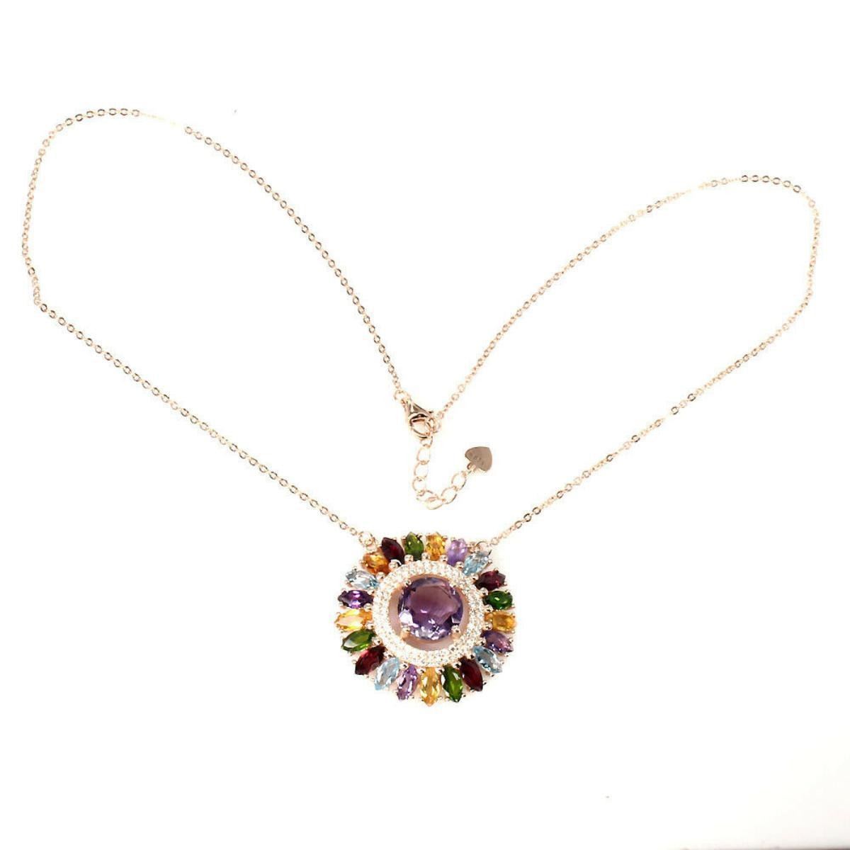 925 STERLING SILVER;PLATE-14K ROSE GOLD;LENGTH (INCHES)16;MAIN STONE-AMETHYST;OTHER GEMS-CHROME DIOPSIDE, CITRINE, CUBIC ZIRCONIA, RHODOLITE GARNET, SKY BLUE TOPAZ;TOTAL WEIGHT-8.5 GRAM (TOTAL WEIGHT OF SILVER + STONE)DIMENSION-* STONE 6.0 X 3.0 TO 10.0 MM. * CZ 1.0 MM. * STONES PART LENGTH 29.0 X 28.0 MM.;MAIN STONE SHAPE-ROUND CUT;MAIN STONE COLOR-TOP RICH PURPLE;CLARITY/GRADE-IF TO VVS;TREATMENT-UNHEATED;ORIGIN-BRAZIL;HARDNESS-7;