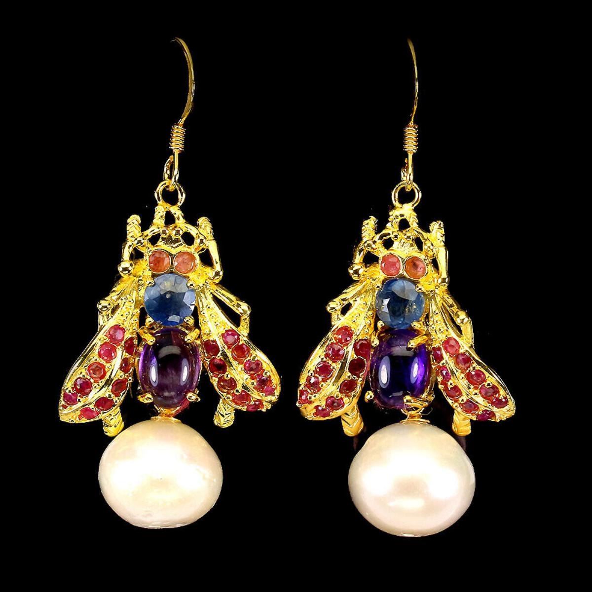 925 STERLING SILVER;PLATE-14K YELLOW GOLD;MAIN STONE-AMETHYST;OTHER GEMS-PEARL, RUBY, SAPPHIRE;TOTAL WEIGHT-12.14 GRAM (TOTAL WEIGHT OF SILVER + STONE);DIMENSION-* STONE 1.5 TO 8.0 X 6.0 MM.* PEARL 13.0 X 11.0 MM.* FACE EARRINGS 46.0 X 22.0 MM.;MAIN STONE SHAPE-OVAL CABOCHON;MAIN STONE COLOR- PURPLE;TREATMENT-UNHEATED;ORIGIN-BRAZIL;HARDNESS-7;