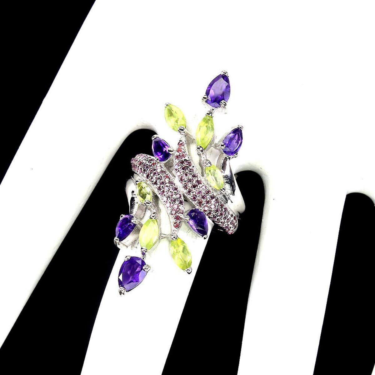 925 STERLING SILVER;PLATE-14K WHITE GOLD;RING SIZE-8.5(RESIZABLE);MAIN STONE-AMETHYST;OTHER GEMS-PERIDOT, RHODOLITE GARNET;TOTAL WEIGHT-9.35 GRAM (TOTAL WEIGHT OF SILVER + STONE);DIMENSION-* STONE 1.0 TO 6.0 X 4.0 MM. * RING SIZE 8.5 * FACE RING 41.0 X 21.0 MM.;MAIN STONE SHAPE-PEAR ;MAIN STONE COLOR - PURPLE;CLARITY/GRADE-IF TO VVS;TREATMENT-UNHEATED;ORIGIN-URUGUAY;HARDNESS-7;