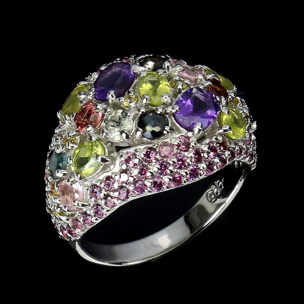925 STERLING SILVER;PLATE-14K WHITE GOLD;RING SIZE-7.5(RESIZABLE);MAIN STONE-AMETHYST;OTHER GEMS-PERIDOT, RHODOLITE GARNET, SAPPHIRE, TOURMALINE;TOTAL WEIGHT-6.5 GRAM (TOTAL WEIGHT OF SILVER + STONE);DIMENSION-* STONE 1.5 TO 5.0 X 4.0 MM. * RING SIZE 7.5 * FACE RING 23.0 X 17.0 MM.;MAIN STONE SHAPE-OVAL; MAIN STONE COLOR-PURPLE;CLARITY/GRADE-IF TO VVS;TREATMENT-UNHEATED;ORIGIN-BRAZIL;HARDNESS-7;