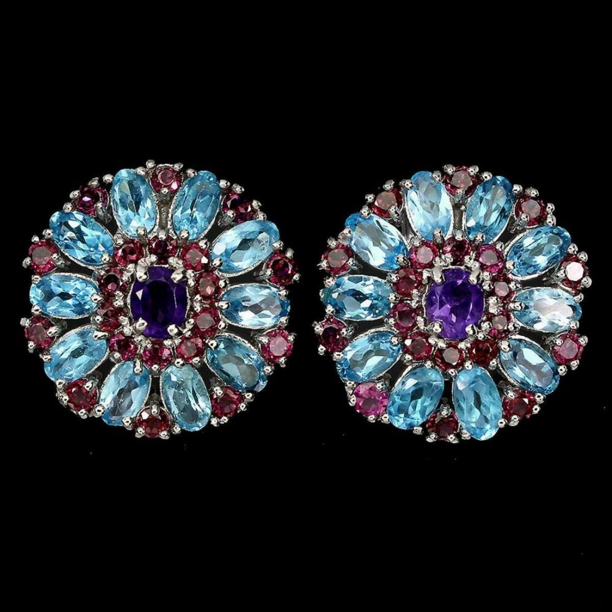 925 STERLING SILVER;PLATE-14K WHITE GOLD;MAIN STONE-AMETHYST;OTHER GEMS-RHODOLITE GARNET, SWISS BLUE TOPAZ;TOTAL WEIGHT-6.15 GRAM (TOTAL WEIGHT OF SILVER + STONE)DIMENSION* STONE 2.0 TO 5.0 X 4.0 MM. * FACE EARRINGS 19.0 MM.MAIN STONE SHAPE-OVAL CUT;MAIN STONE COLOR-TOP RICH PURPLE;CLARITY/GRADE-IF TO VVS;TREATMENT-UNHEATED;ORIGIN-BRAZIL;HARDNESS-7;