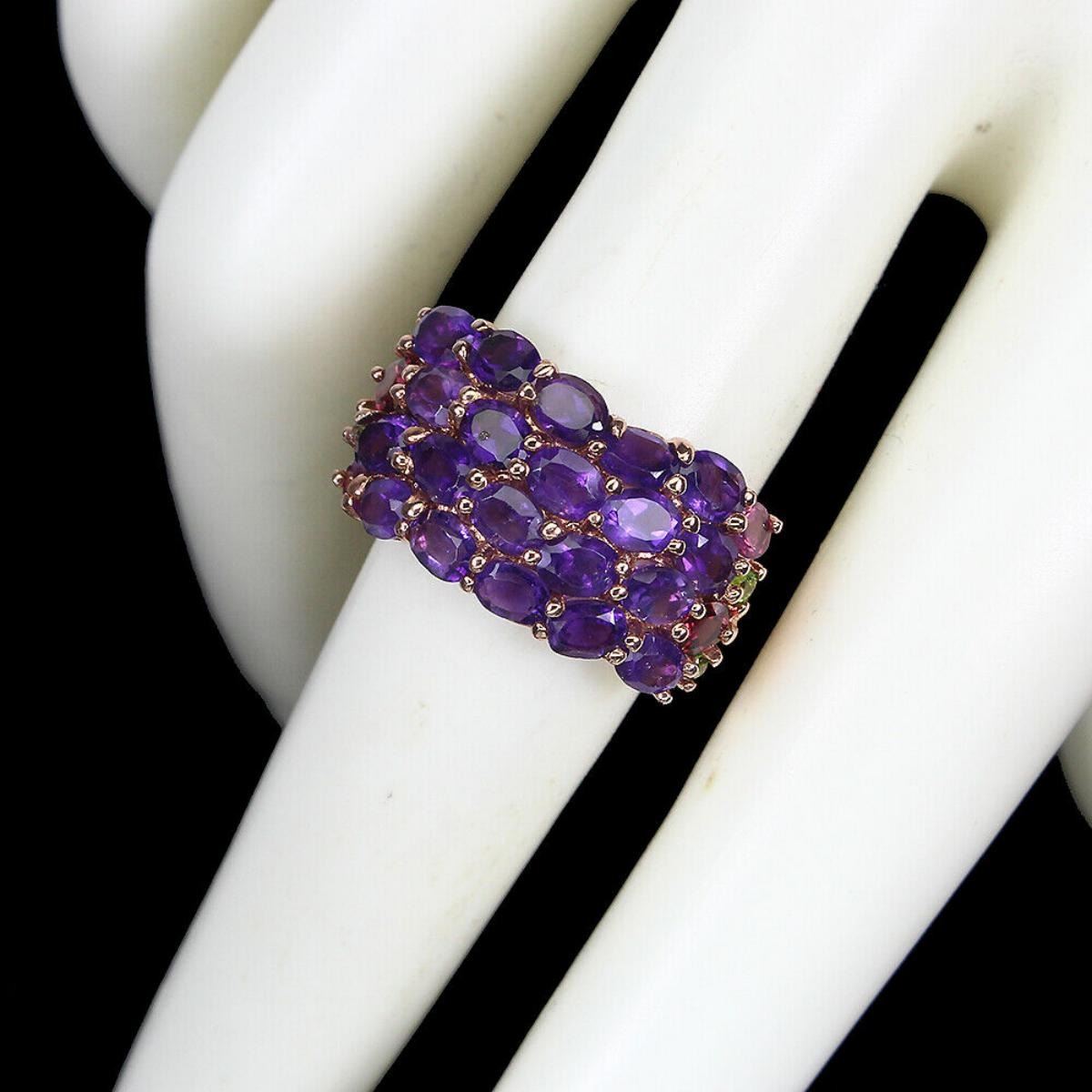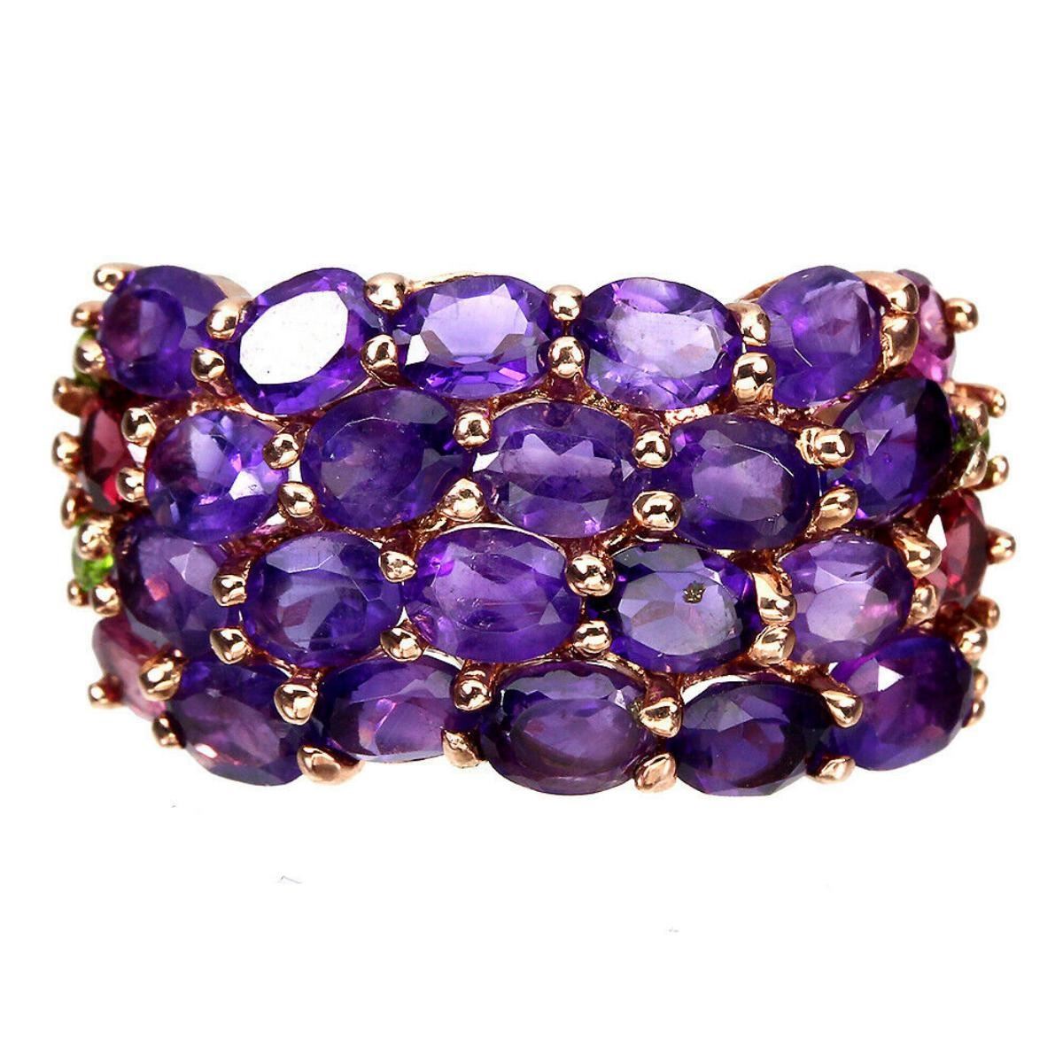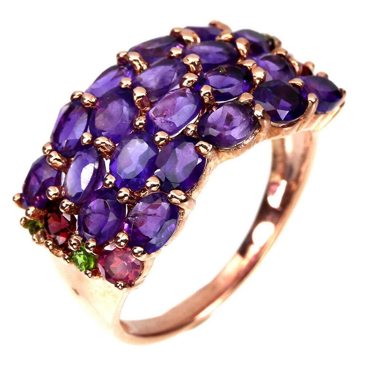 925 STERLING SILVER;PLATE-14K ROSE GOLD;RING SIZE/resizeable-7;MAIN STONE-AMETHYST;OTHER GEMS-CHROME DIOPSIDE, RHODOLITE GARNET;TOTAL WEIGHT-3.15 GRAM (TOTAL WEIGHT OF SILVER + STONE)DIMENSION-* STONE 2.0 TO 4.0 X 3.0 MM.;* RING SIZE- 7.0;* FACE RING -23.0 X 12.0 MM.;MAIN STONE SHAPE-OVAL CUT;MAIN STONE COLOR- PURPLE;CLARITY/GRADE-IF;TREATMENT-UNHEATED;ORIGIN-URUGUAY;HARDNESS-7;