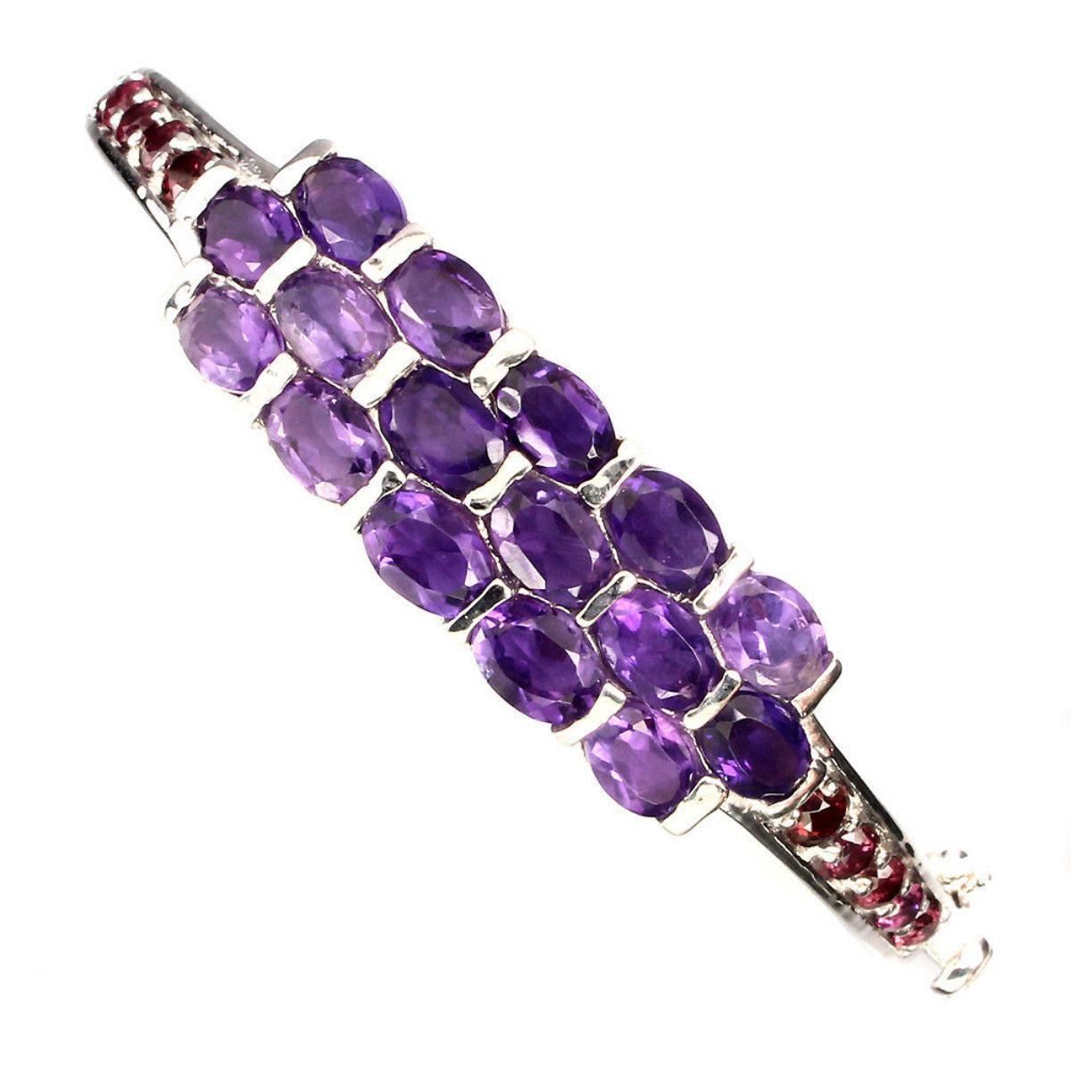 925 STERLING SILVER; PLATE ...14K WHITE GOLD; size - 50 MmM; MAIN STONE AMETHYST OTHER GEMS RHODOLITE GARNET TOTAL WEIGHT 75.99 CT (TOTAL WEIGHT OF SILVER + STONE) DIMENSION * STONE 3.0 TO 7.0 X 5.0 MM. * DIAMETER 2.0 X 1.9 INCHES. * FACE BANGLE 55.0 X 12.0 MM. MAIN STONE SHAPE OVAL CUT MAIN STONE COLOR TOP INTENSE PURPLE CLARITY/GRADE IF TO VVS LUSTER RAVISHING TREATMENT UNHEATED ORIGIN URUGURY HARDNESS 7.0 - 7.5