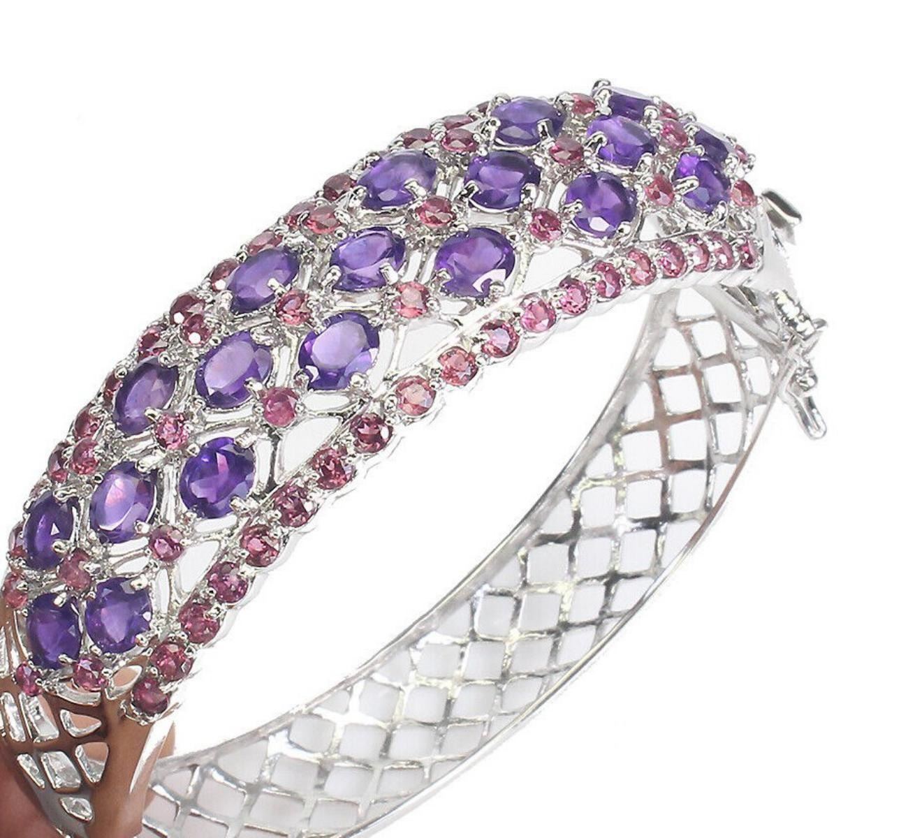 925 STERLING SILVER;PLATE-14K WHITE GOLD;MAIN STONE-AMETHYST;OTHER GEMS-RHODOLITE GARNET;TOTAL WEIGHT-23.77 GRAM (TOTAL WEIGHT OF SILVER + STONE);DIMENSION-* STONE 2.0 TO 5.0 X 4.0 MM.* DIAMETER 2.0 X 1.9 INCHES.* FACE BANGLE 57.0 X 17.0 MM.;MAIN STONE SHAPE-OVAL; MAIN STONE COLOR-PURPLE;CLARITY/GRADE-IF TO VVS;TREATMENT-UNHEATED;ORIGIN-URUGUAY;HARDNESS-7;