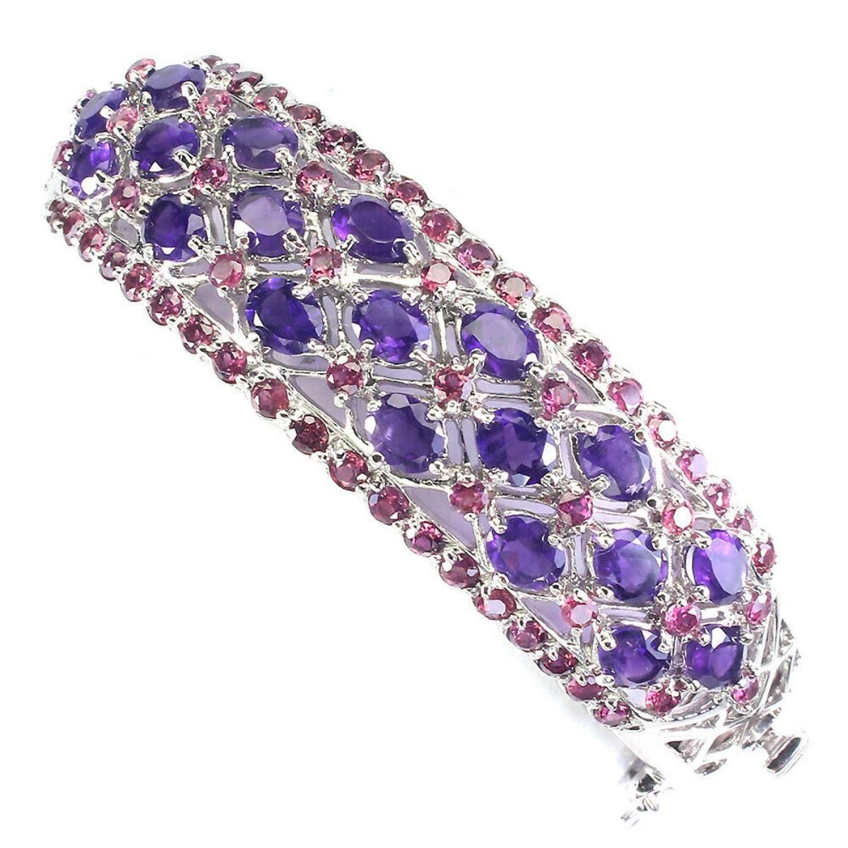 925 STERLING SILVER;PLATE-14K WHITE GOLD;MAIN STONE-AMETHYST;OTHER GEMS-RHODOLITE GARNET;TOTAL WEIGHT-23.77 GRAM (TOTAL WEIGHT OF SILVER + STONE);DIMENSION-* STONE 2.0 TO 5.0 X 4.0 MM.* DIAMETER 2.0 X 1.9 INCHES.* FACE BANGLE 57.0 X 17.0 MM.;MAIN STONE SHAPE-OVAL; MAIN STONE COLOR-PURPLE;CLARITY/GRADE-IF TO VVS;TREATMENT-UNHEATED;ORIGIN-URUGUAY;HARDNESS-7;